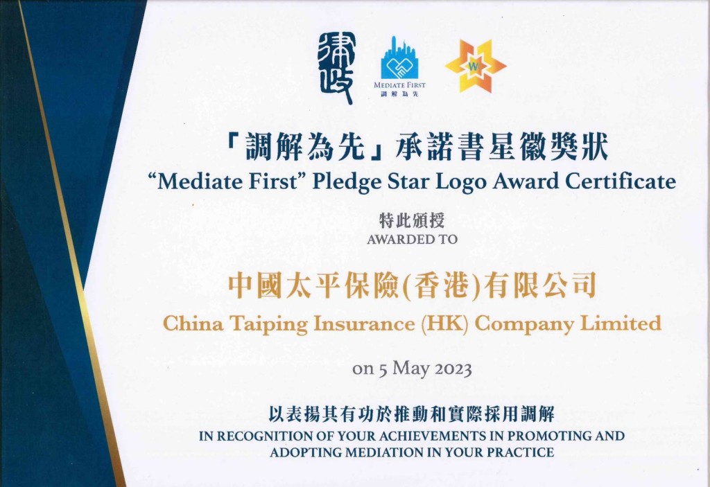 ▲太平香港先后三次获颁律政司调解为先承诺书星徽奖励。