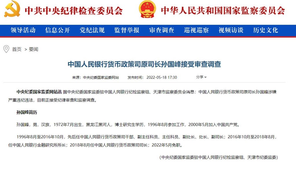 《财新》去年曾报道,孙国峰出事主要因其个人问题,与央行的货币政策无直接关系。他2021年曾因安排其任职文工团的妻子到中央国债登记结算有限公司工作遭到举报,之后又因个人作风问题遭人实名举报。