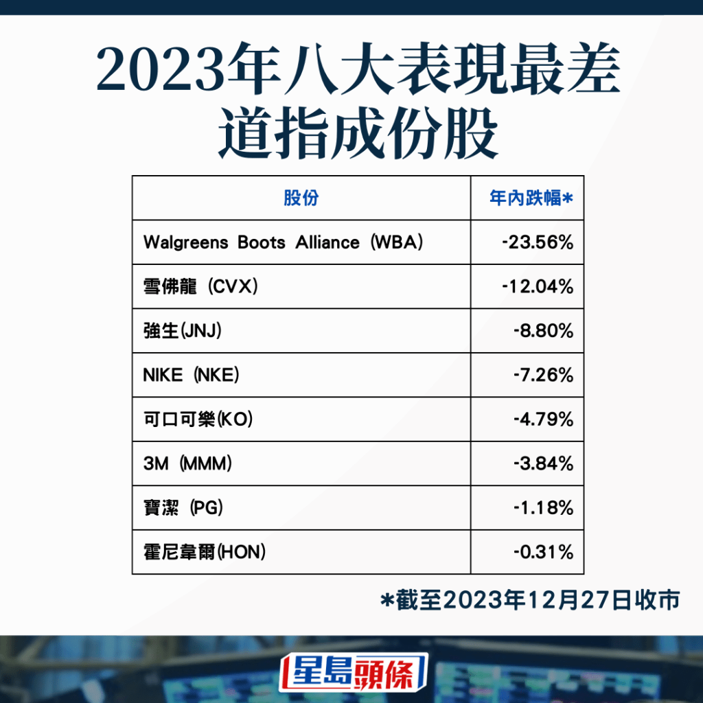道指在今年底发威,带动全年累升近14%,成份股中只有8只股份“见红”。 不过,3只2022年的狗股中,今年继续跑输大市,其中3M(MMM)及NIKE(NKE)年内分别跌4%及7%; 药店连锁品牌Walgreens Boots Alliance (WBA)去年跌25%后,今年更再跌24%。 今年新晋的道指狗股则分别是雪佛龙(CVX)、强生(JNJ)、可口可乐(KO)、宝洁(PG)及霍尼韦尔(HON)。