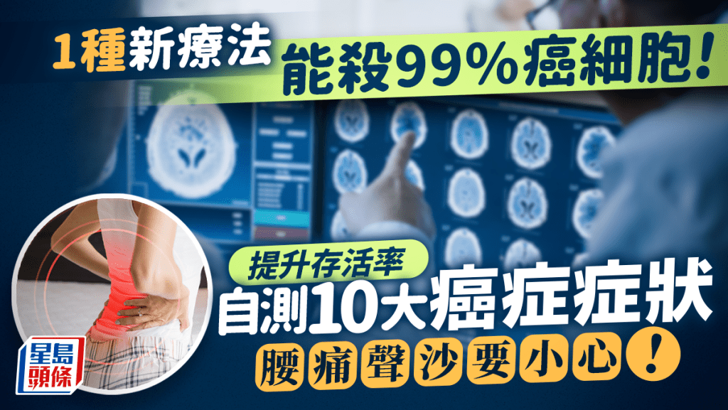 癌症治疗又一新突破!美国一项最新研究发现,一种新型癌症治疗方法能杀死99%癌细胞,被视为重大突破。据统计,港人主要死因的第一位为癌症(恶性肿瘤),最多人死于肺癌、大肠癌、肝癌。有医生教大众分辨癌症10大先兆,自测症状,及早发现,以提高存活率,若持续腰痛、声沙则要小心!