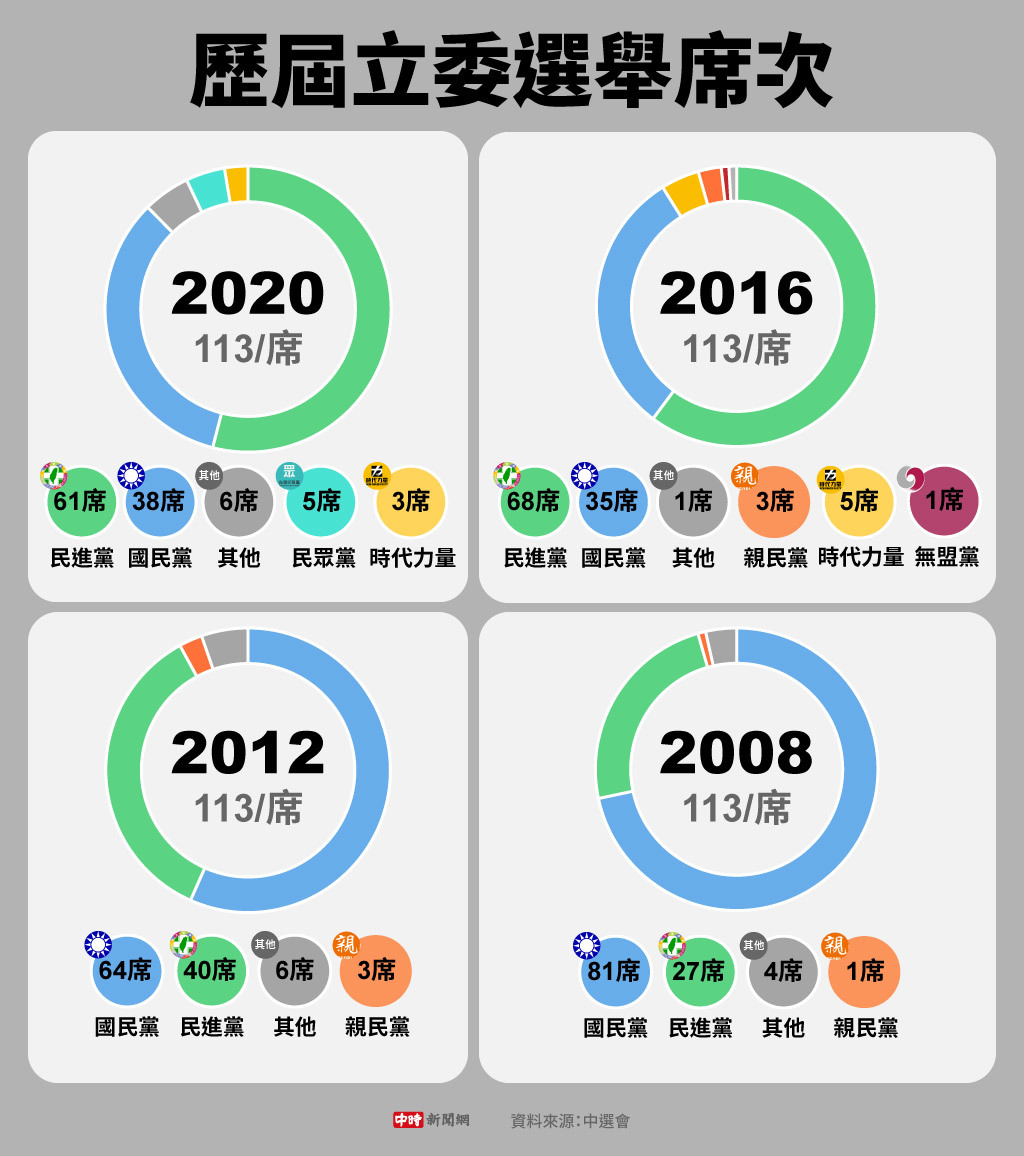 ▲2008至2020年,历届“立委”选举各政党席次变化。(制图/中时新闻网)