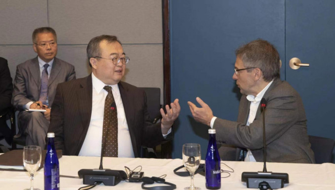 ▲刘建超在对话会上和欧亚集团总裁布雷默见面。