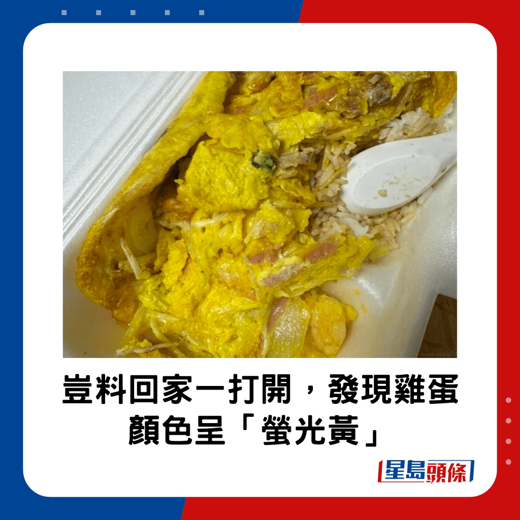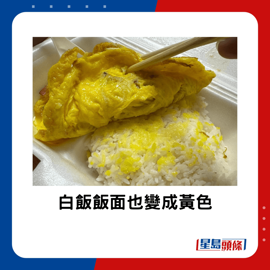 茶餐厅客饭向来都是不少人的午餐首选,不过最近有网民在茶餐厅买了一个芙蓉蛋饭,打算回家好好享用之际,发现饭盒里的鸡蛋颜色竟然呈“荧光黄”,而且入口没有蛋味,而芙蓉蛋饭上本应有的甜豉油亦“失踪”,令他大感失望。帖文引起不少网民回应,有人留言笑指“蛋都会掉色”,亦有任职厨房的网民称是正常现象,全因不少餐厅都会在蛋浆内加入一款食材,令鸡蛋颜色看上去更吸引?