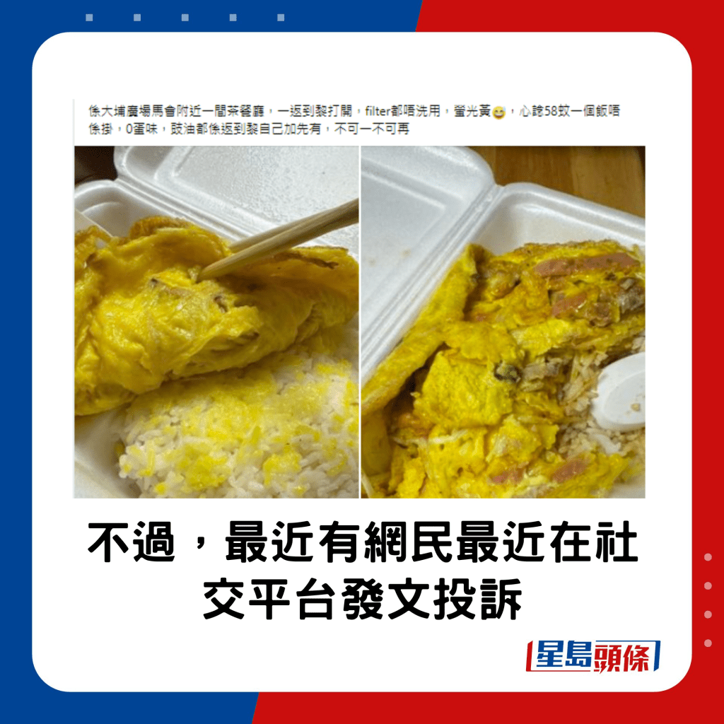 最近,有网民在社交平台“饮食黑店大全(全港食店质素/价钱/服务关注组)”发文投诉,表示日前在大埔一间茶餐厅买了一个价值$58的芙蓉蛋饭,岂料回家一打开,发现鸡蛋颜色呈“荧光黄”,而且毫无蛋味,连豉油“都系返到黎自己加先有”,直言“不可一不可再”!
