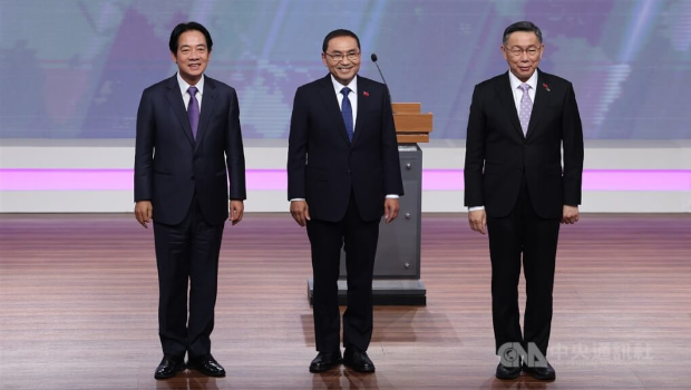 ▲民进党籍候选人赖清德(左)、国民党籍候选人侯友宜(中)与民众党籍候选人柯文哲(右)电视辩论会前合影。中央社