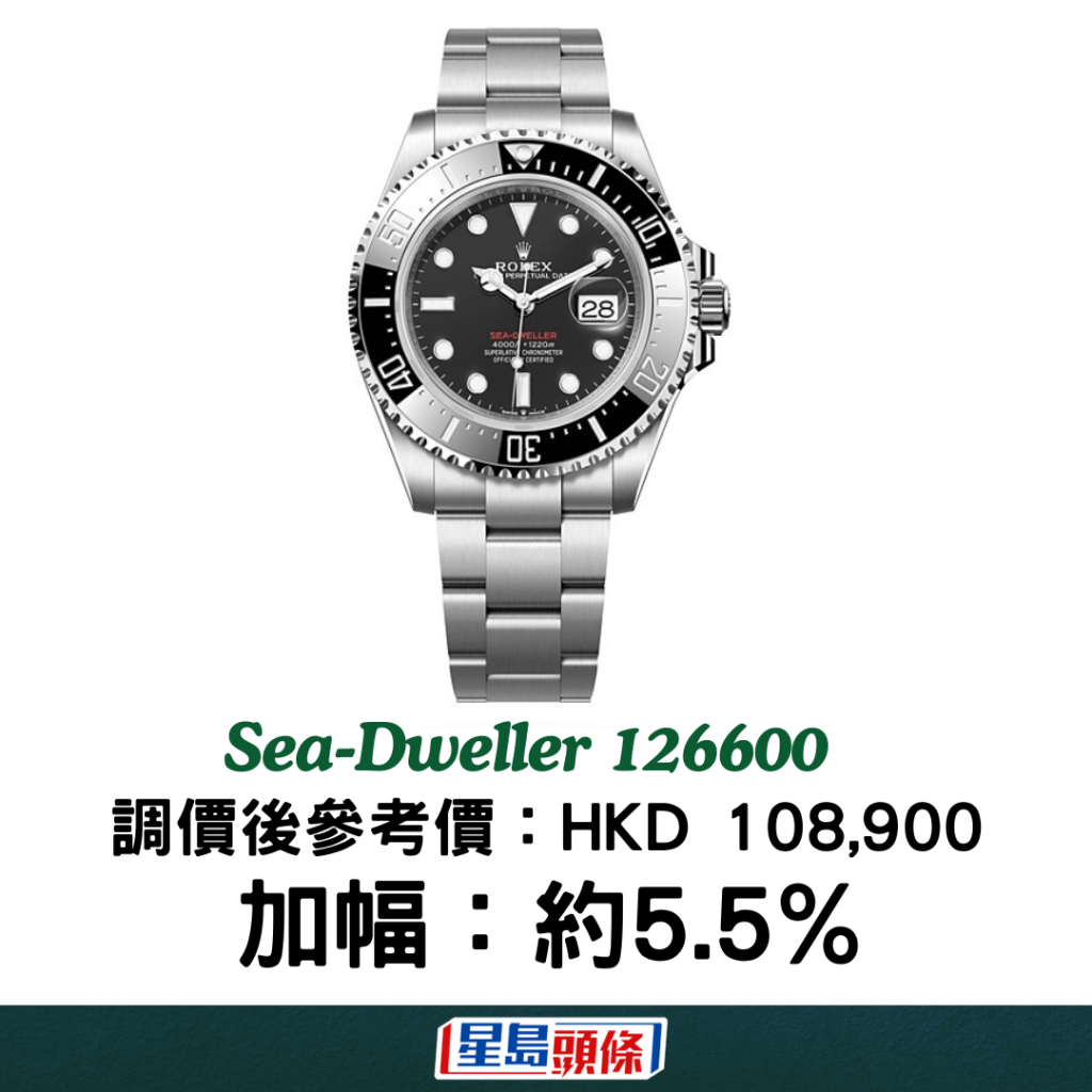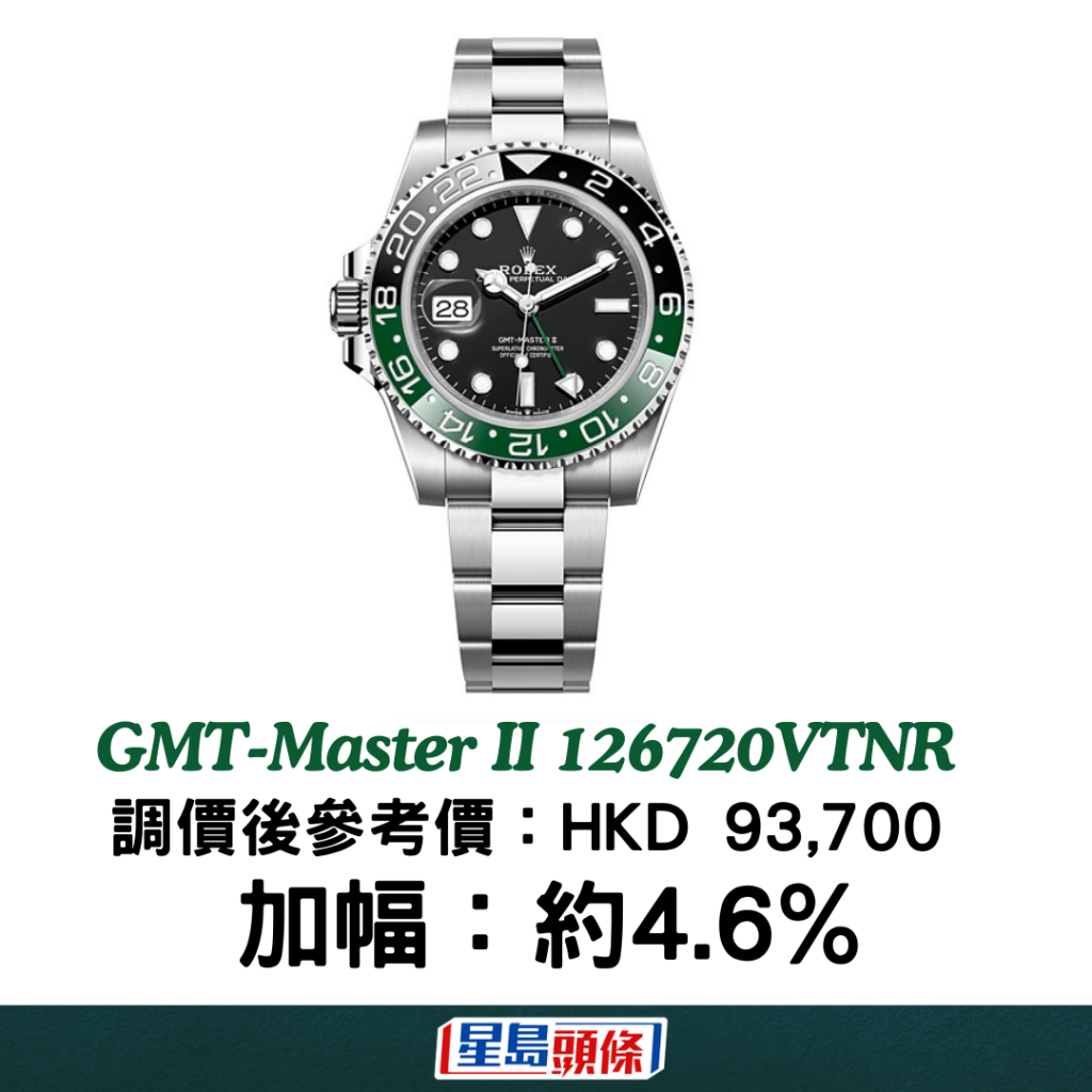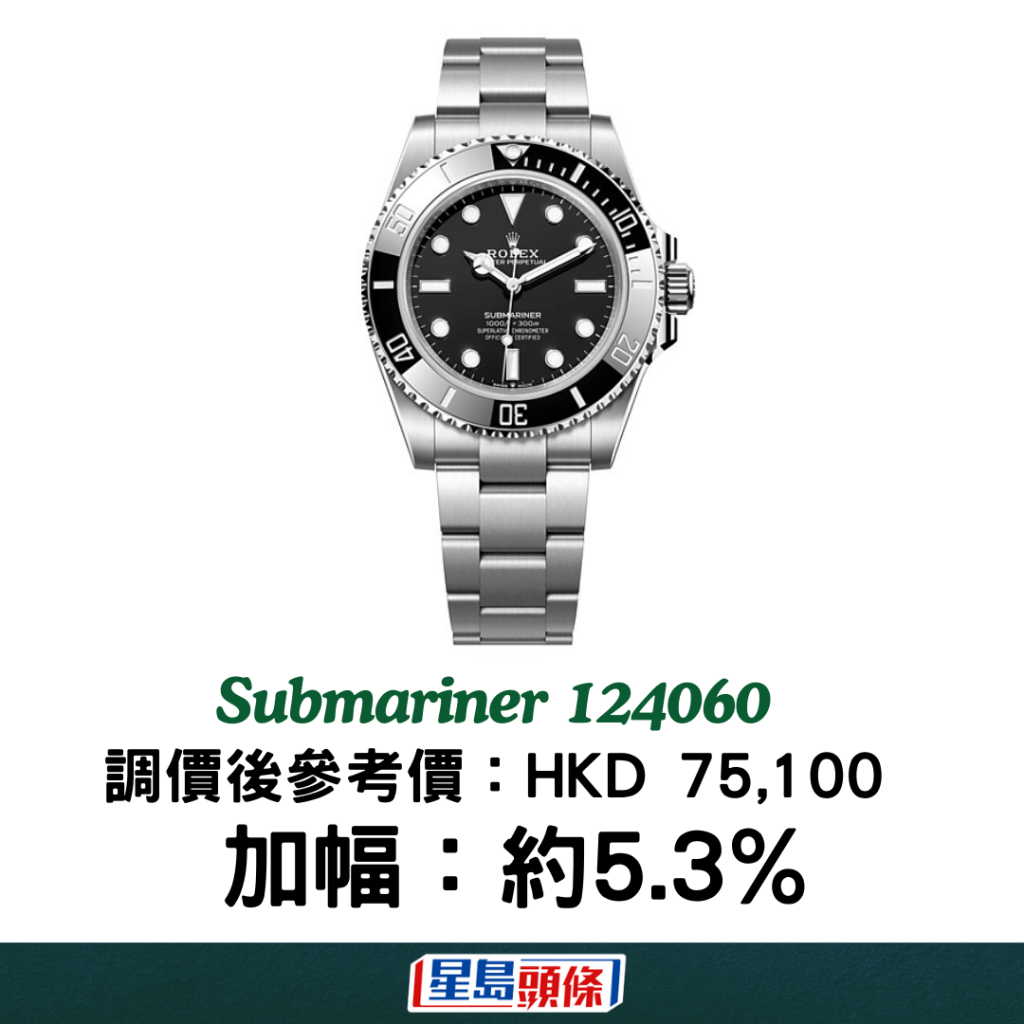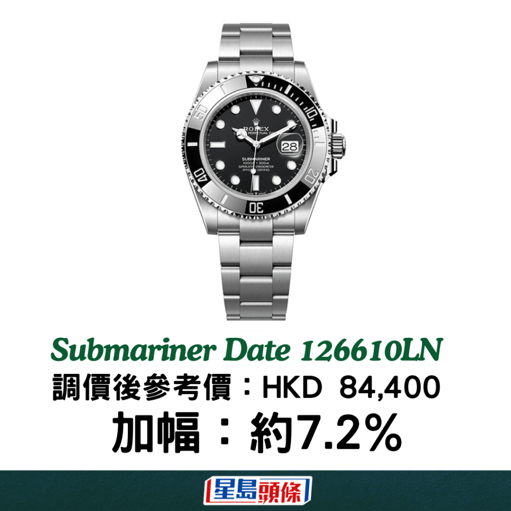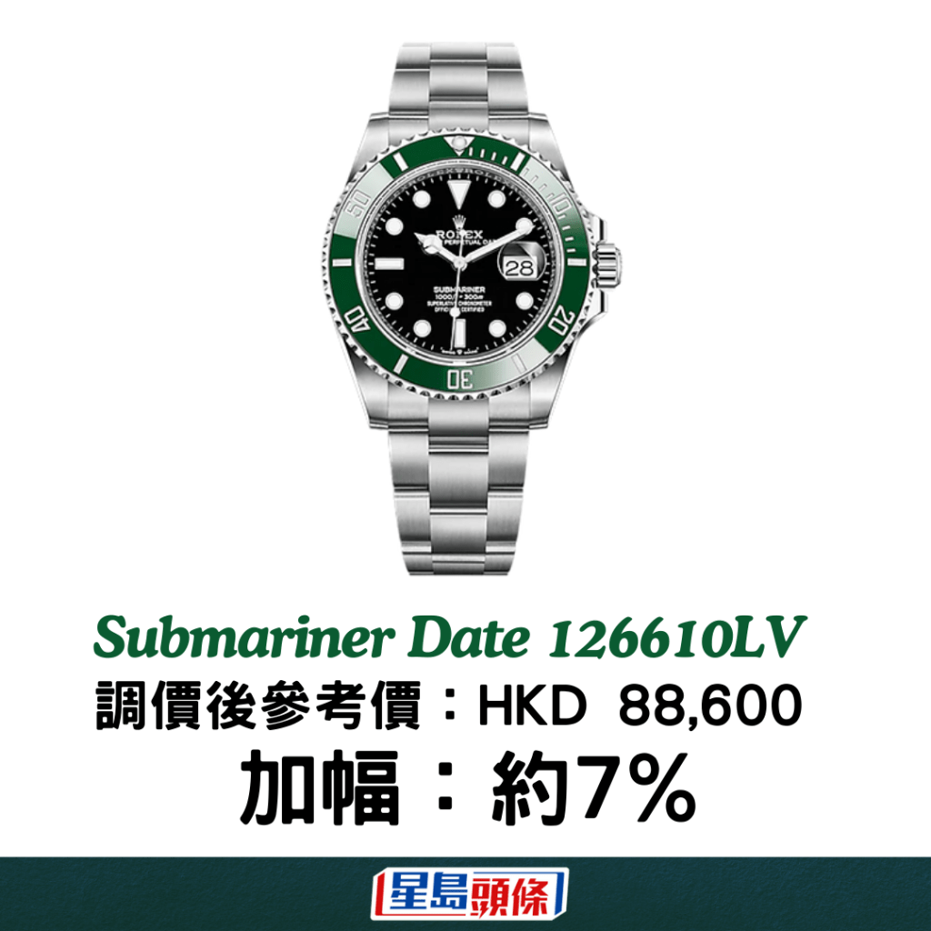 彭博报道,各地市场的加价幅度差异,与不同地区的经济状况、汇率波动以及市场需求变化相关。英国及欧洲市场约4%,内地市场则是约7%,美国地区定价维持不变。至于香港平均加幅为4.72%,例如俗称“绿水鬼”Submariner Date 126610LV官方定价由82,800港元加至88,600港元,迫近9万大关。