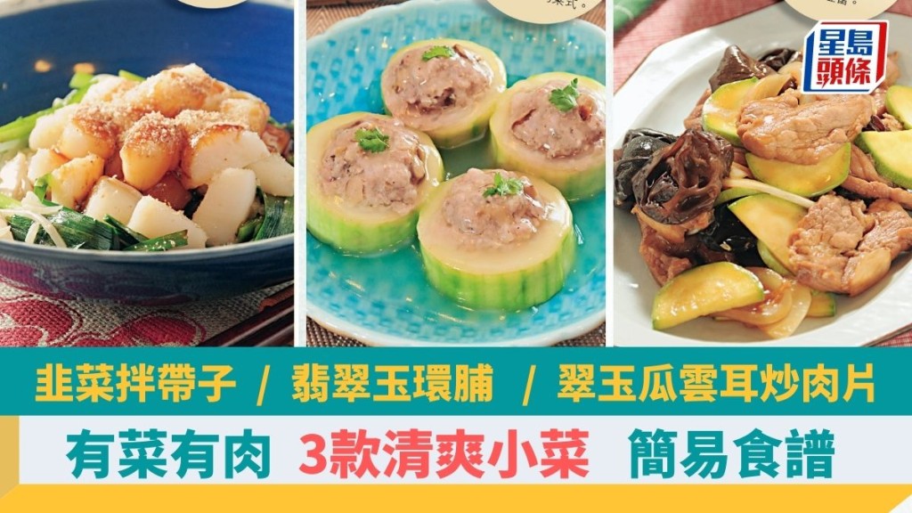新年家常菜简易食谱|有菜有肉的家常菜,既富营养,口感又丰富。今日教大家烹调3道鲜味家常菜,包括翡翡翠玉环脯、翠玉瓜云耳炒肉片、韭菜拌带子,分别以爽口的节瓜、翠玉瓜及韭菜,配猪肉及带子烹调,材料及做法均简单,轻易煮出鲜香家常菜。