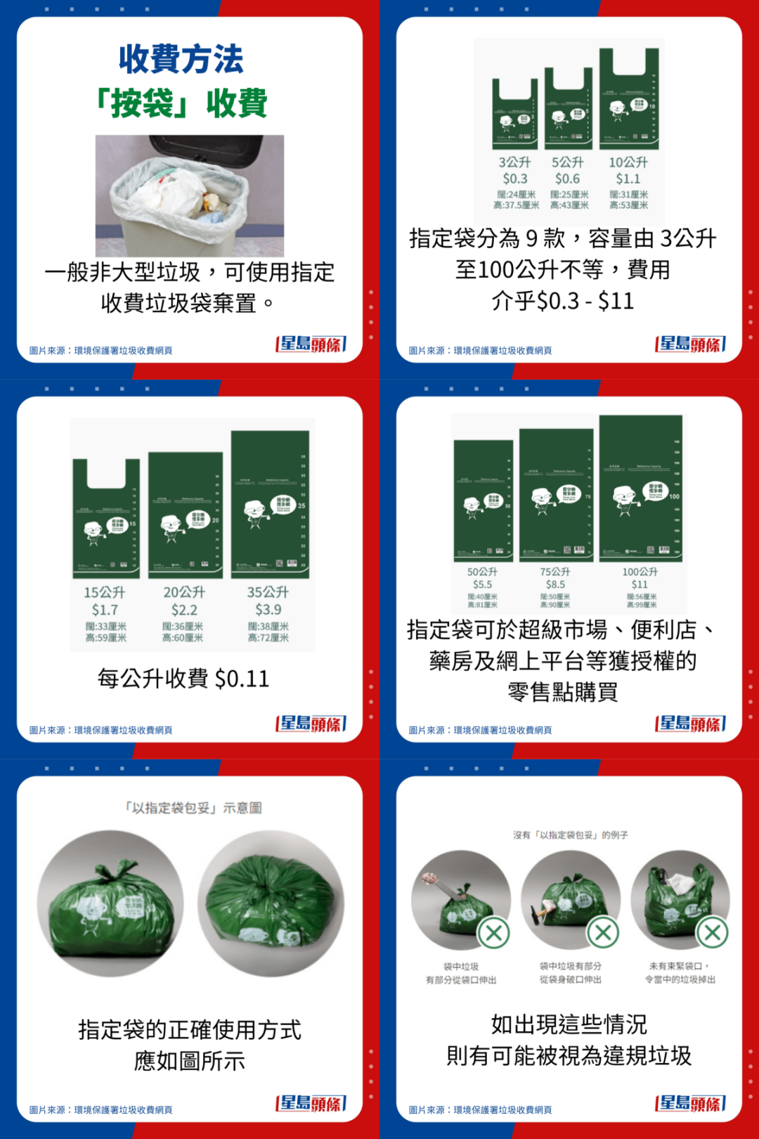环境保护署环境保护主任(减废及社区回收)简炜尧指,根据上述收费准则,环保署估计如3至4人家庭,每日使用1个10公升或15公升的指定垃圾袋,一个月需支付的垃圾袋征费费用就大约是 $30 - $53港元。
