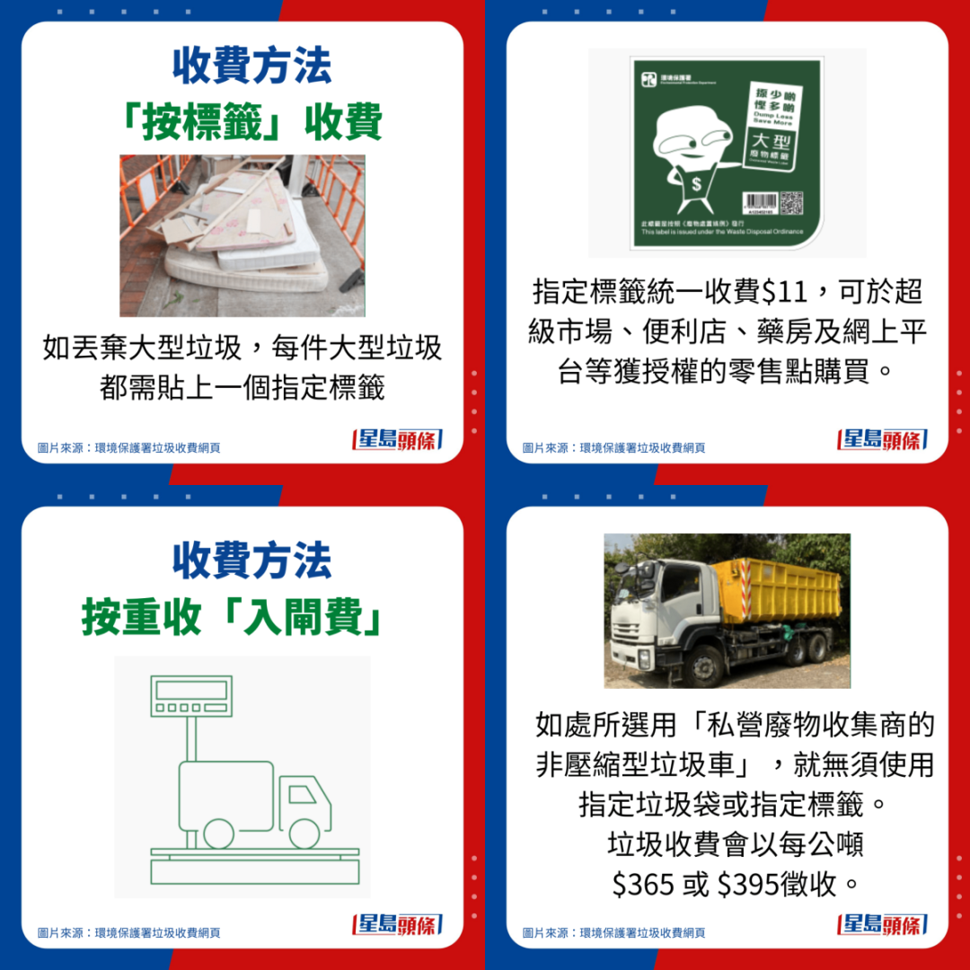 如丢弃家私等大型垃圾,每件大型垃圾都需贴上一个指定标签,指定标签统一收费定价为$11,可于超级市场、便利店、药房及网上平台等获授权的零售点购买。