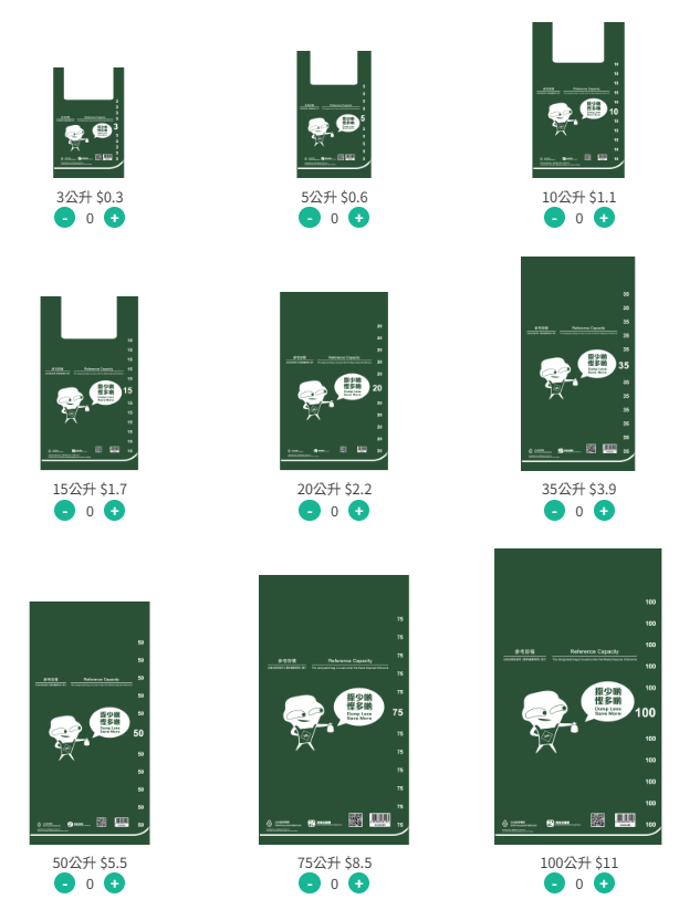 指定袋右侧的数字,代表有关指定袋的参考容积(以公升计),视乎指定袋大小该数字会有所不同,其中一个标示数字会加大。