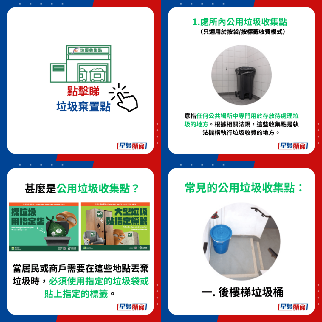“按袋”/“按标签”收费模式下的公用垃圾收集点是指任何公共场所中专门用于存放待处理垃圾的地方。 根据相关法规,这些收集点是执法机构执行垃圾收费的地方。 当居民或商户需要在这些地点丢弃垃圾时,必须使用指定的垃圾袋或贴上指定的标签。