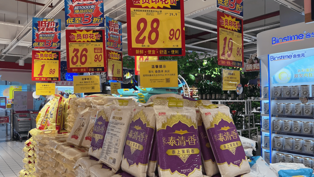 ▲不同产地的大米都有售。图片来源:Youtube@及及爸的败家周记