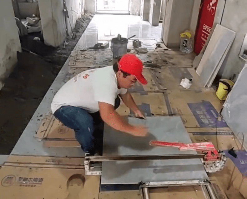 ▲贴砖工人吴先生正在用切砖机修改砖块尺寸。
