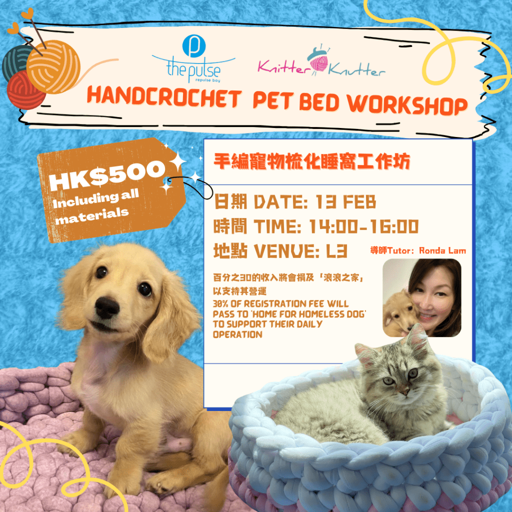 完成慈善行后,商场2楼设有Knitter Knutter举办的手织狗狗梳化睡窝工作坊,亲手为毛孩编织一张3色梳化睡窝,过一个温暖冬日!