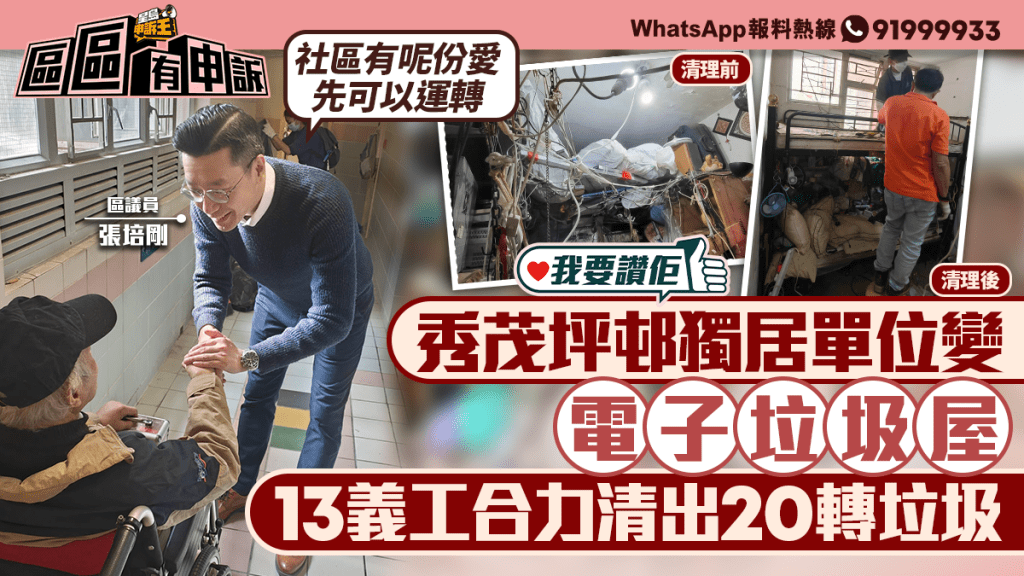 垃圾屋无处不在,部分原因涉及老户主年轻时储入不少物件,年迈时无力清理,需有心人施以援手。观塘民联会近月收到一个求助个案,指秀茂坪邨一名行动不便的独居伯伯,其单位囤积大量电子产品及装修物料,物品多至无法关上大门及铁闸,最终透过社工及义工队合力协助,清出垃圾总量足以填满20个660升垃圾箱,并将单位成功恢复原有模样,获区议员赞许“社区系要靠义工们呢份爱 ,先可以运转落去。”