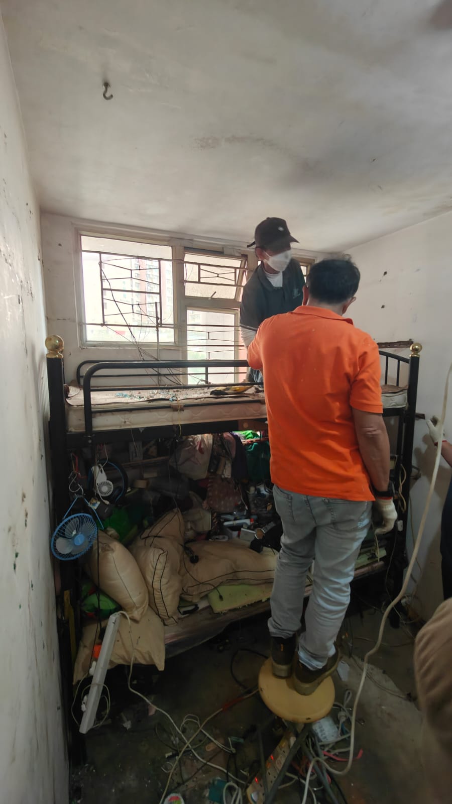 观塘民联会社工透过座头保安了解详情后,再与男户主女儿沟通,成功说服男户主同意清走屋内垃圾,至上周六(13日)联络建祝义工队一共13名义工,由中午12时起入屋清理,结果花了近3小时,垃圾填满20个660升垃圾收集箱,悉数推往垃圾站,才成功将单位恢复原始状态,“今次见得返客厅、睡房同张上下格床。”义工将进行基本清洁还原至近乎“清水楼”交还伯伯居住,让他有更寛敞的活动空间,而卢伯事后紧握区议员张培刚的双手及对义工们表示感谢。