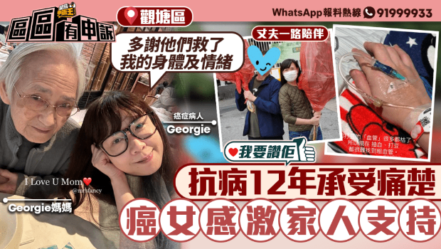 Georgie透过病人组织《癌症信息网》撰文予“我要赞佢”,感激在抗癌路上,一直有身边亲人及朋友的陪伴,尤其是经历丧夫之痛不久的妈妈,又面对女儿患病,心情肯定相当难受,但也伴她同哭同笑。