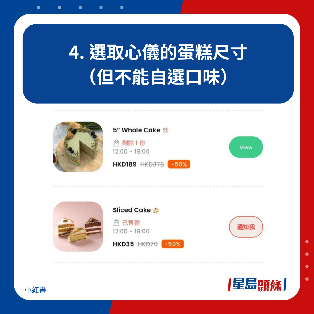 客人可以在平台上以五折购买一个五英寸的蛋糕,不过并不能指定选取味道,下单后便可到自选的蛋糕店自行取货,方便又快捷,各位以后要购买生日蛋糕给亲朋好友,不妨选用这个平台!平台另有不同合作商户,当中不乏一些五星酒店,值得留意!