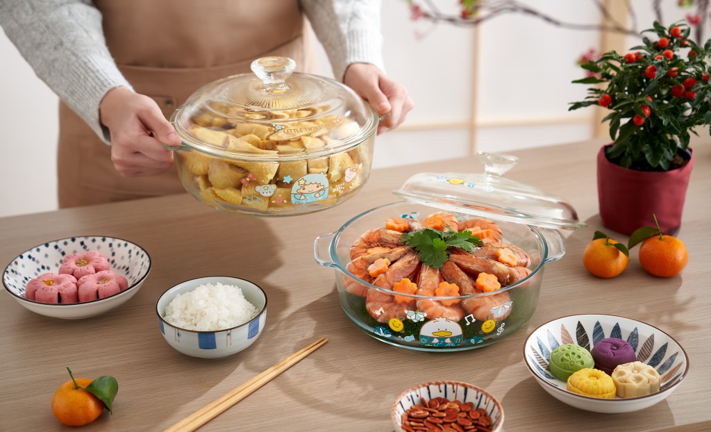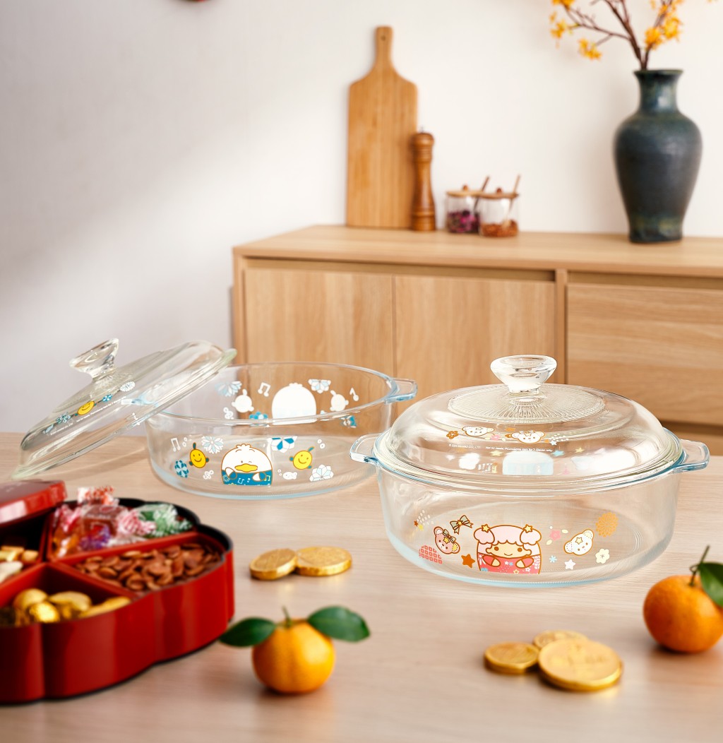 两款“满载祝福玻璃盘”以天天都糖黐豆的 Little Twin Stars 和雪白又可爱的 Ahirunopekkle (AP鸭)作为主角,圆滚滚的造型更显活泼和淘气的一面!“Little Twins Stars 满载祝福玻璃盘”一面印有Kiki头像,另一面则印有LaLa头像,更有二人的好朋友Puff和Poff同框,粉色设计加上碎花及星星图案,梦幻又实用!而另一款“Ahirunopekkle满载祝福玻璃盘”则以蓝色为主调,两面印有不同表情Ahirunopekkle和其好朋友小鱼 Pitchi的头像,配上蓝白小花图案更添淘气!圆形的“满载祝福玻璃盘”采用以Borosilicate玻璃制造,耐冷耐热,可以直接放入微波炉、焗炉加热使用(盖除外)!玻璃焗盘耐受温度为0°C-180°C,容量约2升,适合在新春时用来制作年糕、萝卜糕,或者盛载盆菜、捞起等!配上玻璃盖设计,可更方便保储食物,玻璃盘更通过美国FDA要求,一家大小都可以安心使用。