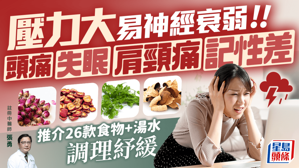 都市人生活及工作压力大,容易引发很多疾病,“神经衰弱”是其中之一。 这个综合征候群可涉及多种症状,例如头痛、失眠、肩颈痛、记性差等。 注册中医师张勇指,中医学防治此症,主张集中缓减患者的精神压力。 他推介26款食物及汤水食疗,透过饮食调理心、肝、脾3大主要脏腑,放松紧张情绪,并改善生理上的不适症状。