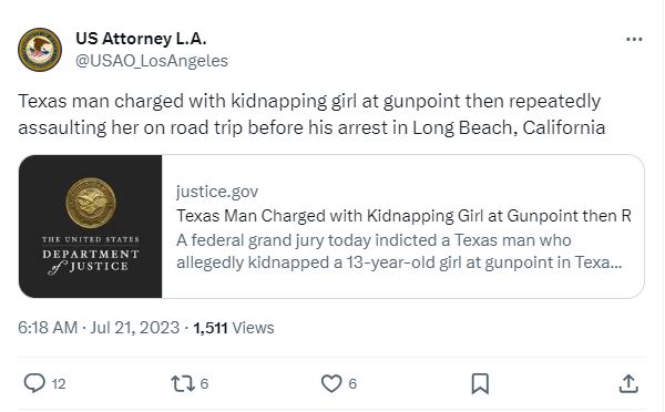 据CNN及《每日邮报》等报道,这宗绑架强奸未成年女孩的案件,发生在去年7月6日。62岁男子萨布兰(Steven Robert Sablan)开车途中,在德州圣安东尼奥,举枪威吓13岁的受害人,将她绑架上车,再将车驶至加州长滩。
