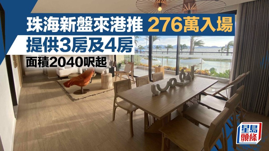由中国旅游集团发展,位于珠海泉湾度假区是国家旅游休闲度假示范区,结合滨海特色,打造一座度假风情的全生态居所,是次来港推售为别墅式独立洋房,面积由2040至2460方呎,每座洋房配私家花园、设有3至4层宽敞空间,地下车库可直接入屋,售价由人民币约247万起,折合港币约276万。