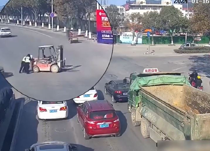 ▲监控拍下女交警推铲车的情况。