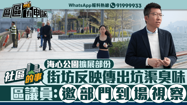 供市民休戏的公园,如果传来恶臭,可谓十分“赶客”。有九龙城街坊投诉称,海心公园扩建部份,不时传出令人作呕的坑渠味,有人更因为难抵臭味而感到不适。当区区议员怀疑是因为喉管接驳错误,计划邀请有关部门到场视察,找出问题根源。