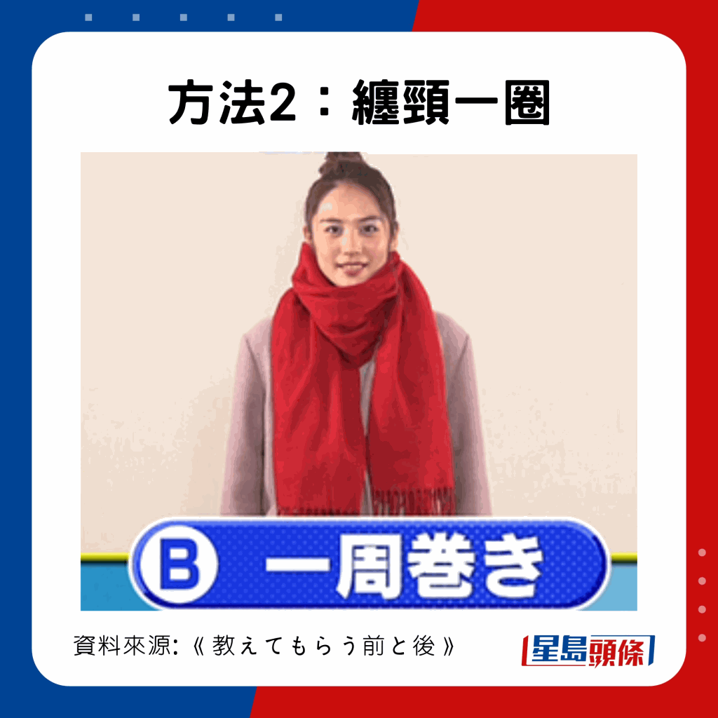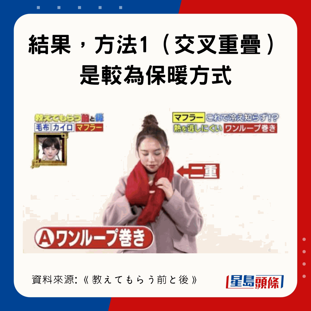 专家指出,颈巾要缠颈几圈,还是交叉重叠,保暖效果也不一样。想留住暖空气,可尝试以上做法,令颈部更温暖,以令全身保持暖和。
