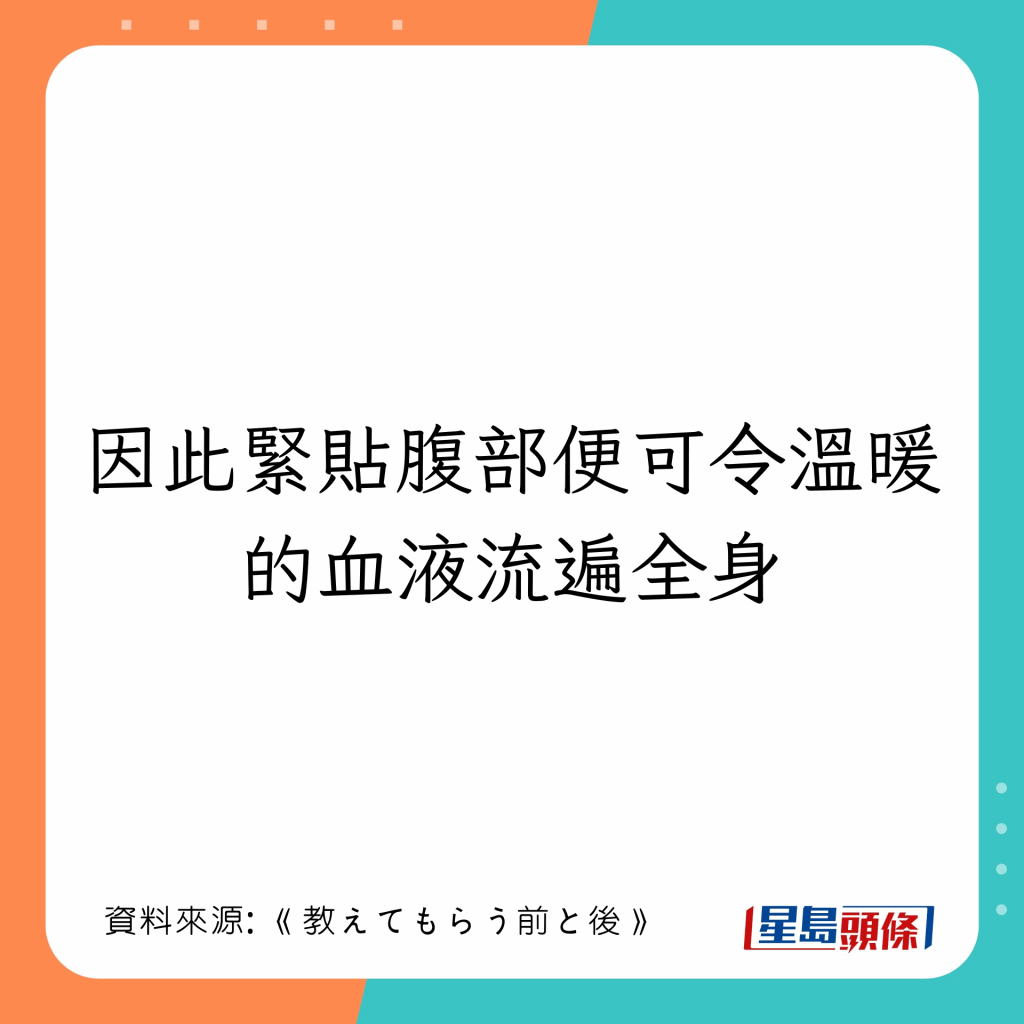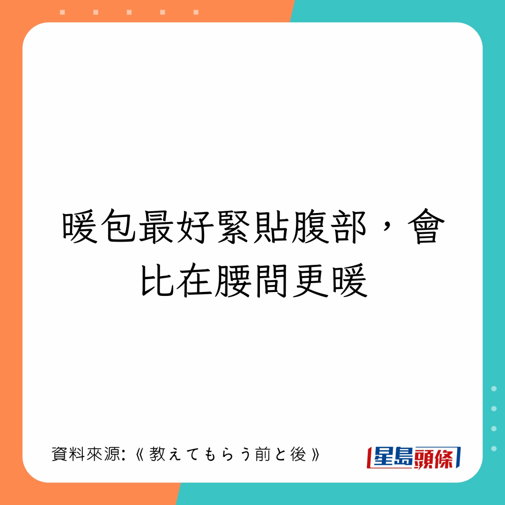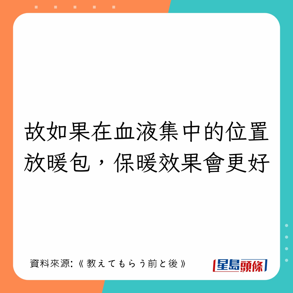 如何用暖包发挥才最大效用? 专家亦指出,暖包的摆放位置亦会影响保暖效果,若按以下做法,则有助促进身体血液循环,令全身更暖: