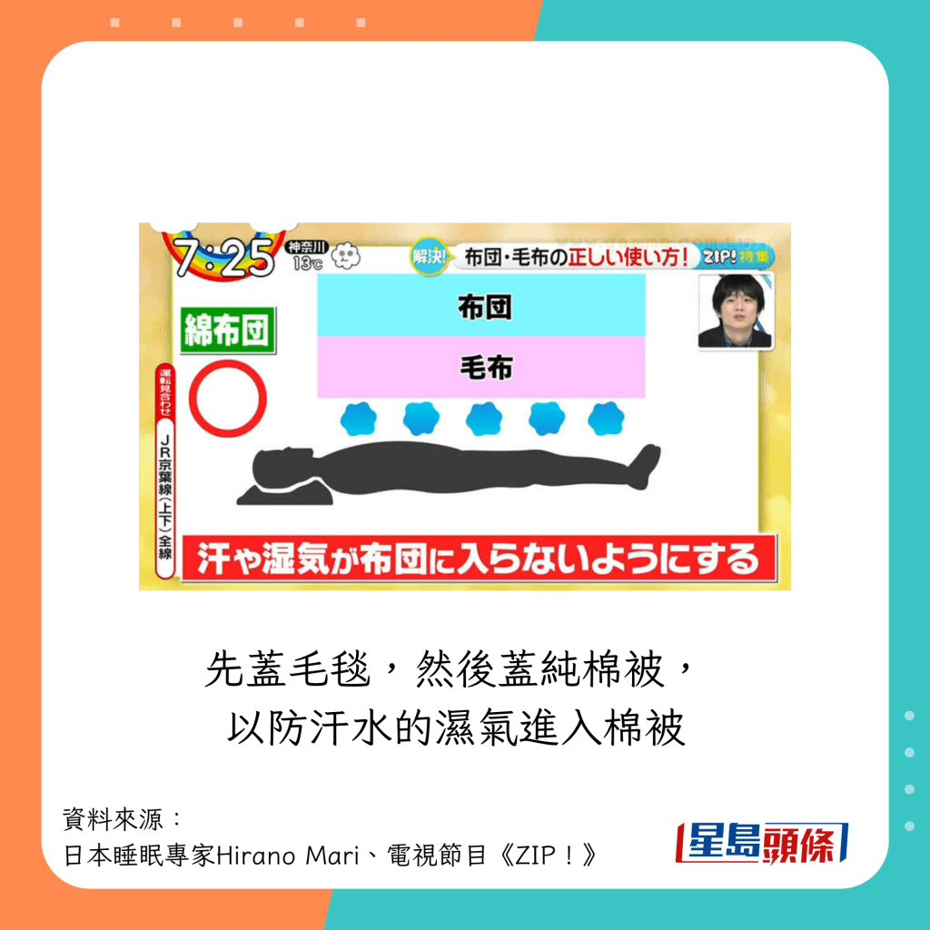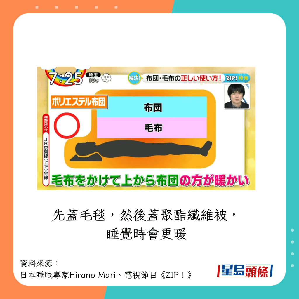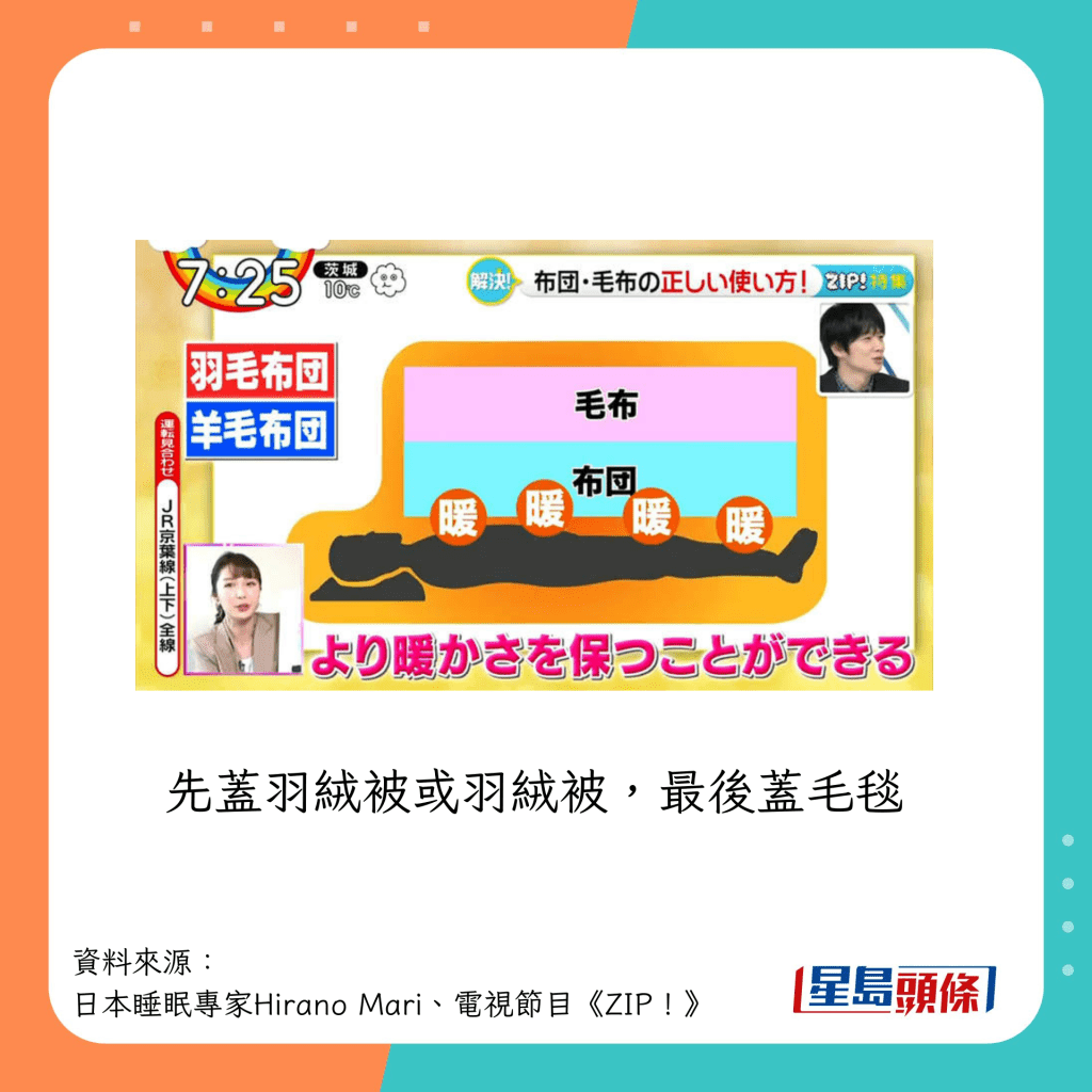 Hirano Mari表示,羽绒、羊毛的保暖度比较高,有助维持体温,建议采用以下盖被次序,以发挥其最大效用: