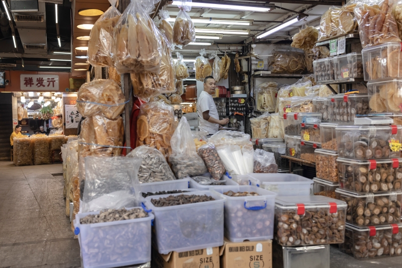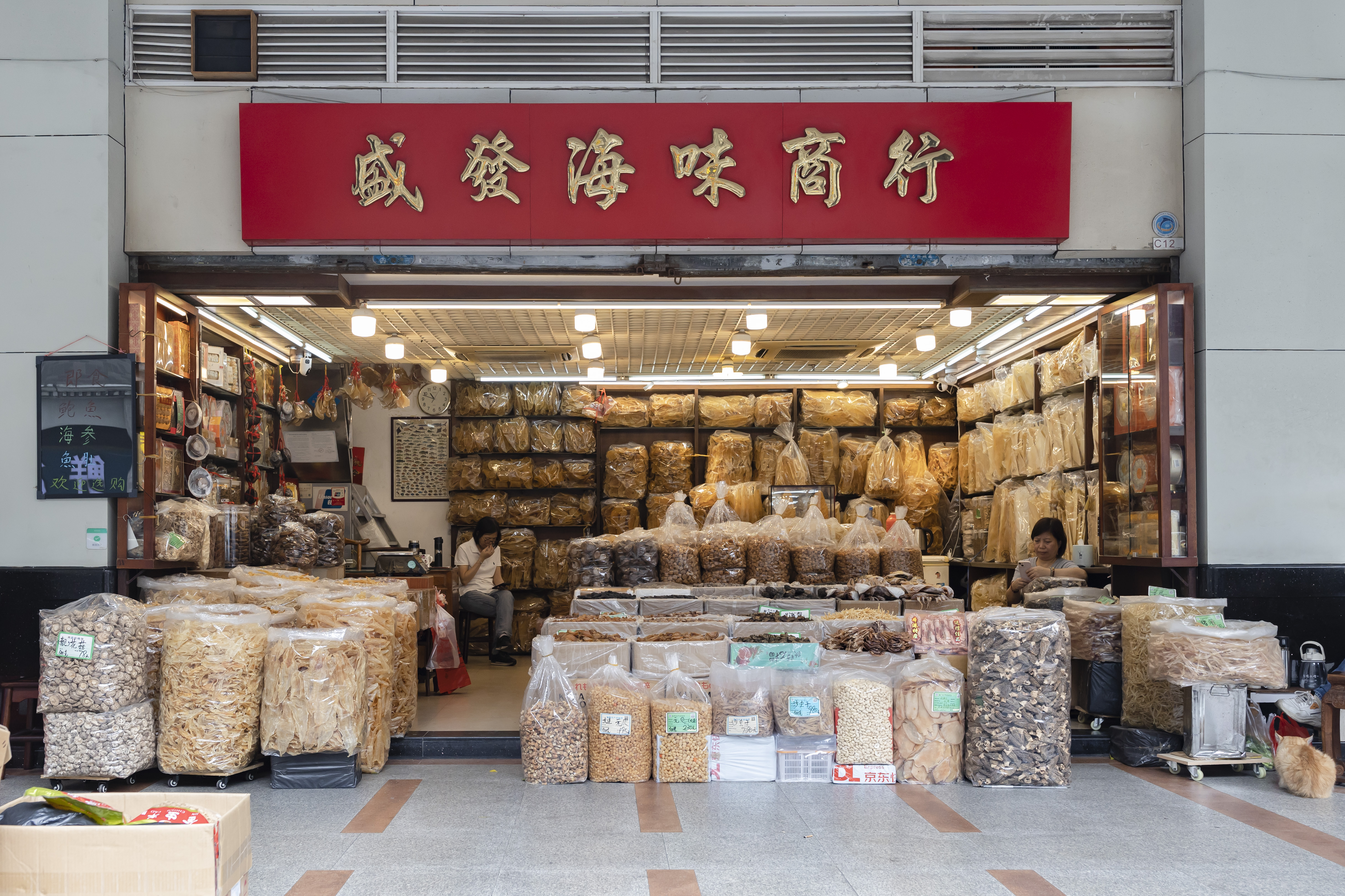 今天,海味干果仍是一德路的金字招牌。从长堤大马路拐往海珠南,进入一德路,向东走,山海城、海中宝……大型综合市场一个接一个,密密麻麻的海味店铺连内街小巷都不放过,满满当当的海味干货或摆在柜面上,或装在透明塑料袋里,悬挂于空中,供客商挑选,品种从“章犹地墨”到“鲍参燕”,能满足你对海味的所有想象。手推车运载着大包小包的干货,发出“哐啷哐啷”的声音,档口谈生意的人都不得不提高嗓门。一辆辆小推车构筑了一德路货如轮转的血脉,支撑着这里的贸易王国。