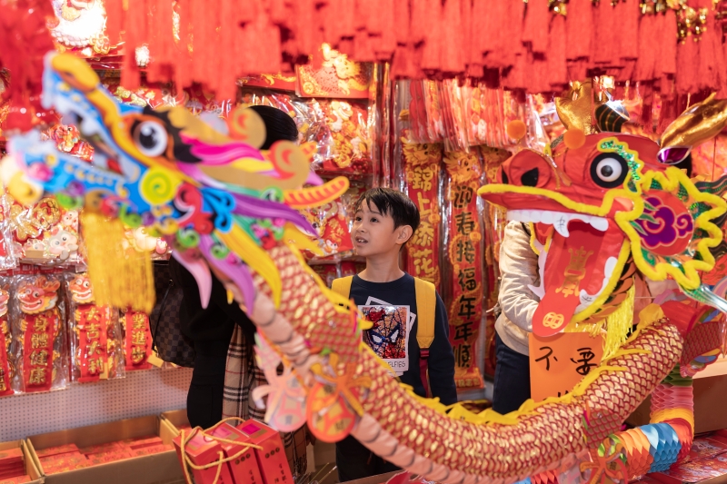 出了万菱广场,再往前走,就是德宝交易市场,但见一抹抹“中国红”连成一片,红灯笼、春联、中国结、龙年挂饰、福字,还有一沓沓利是封……看上去十分喜庆。