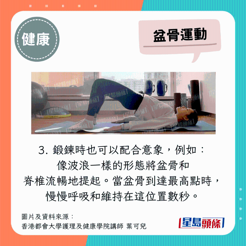 锻炼时也可以配合意象,例如:像波浪一样的形态将盆骨和脊椎流畅地提起。当盆骨到达最高点时,慢慢呼吸和维持在这位置数秒。