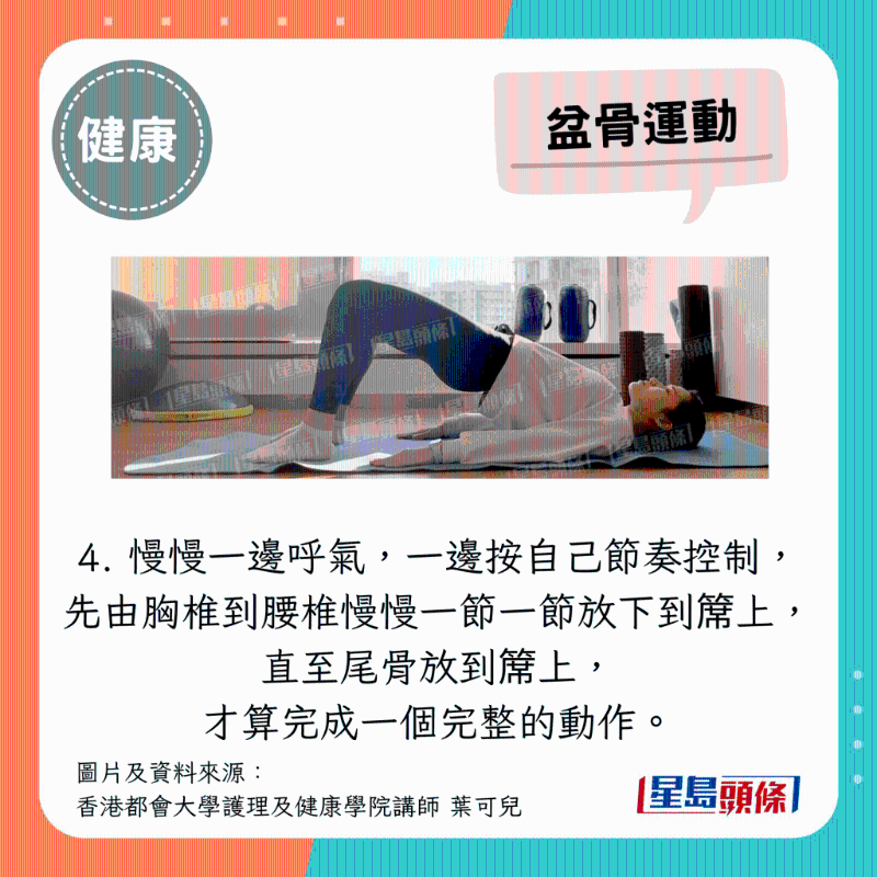 然后慢慢一边呼气,一边按自己节奏控制,先由胸椎到腰椎慢慢一节一节放下到瑜伽垫上,直至尾骨放到席上,才算完成一个完整的动作。
