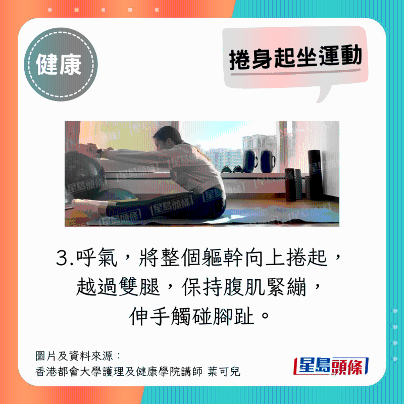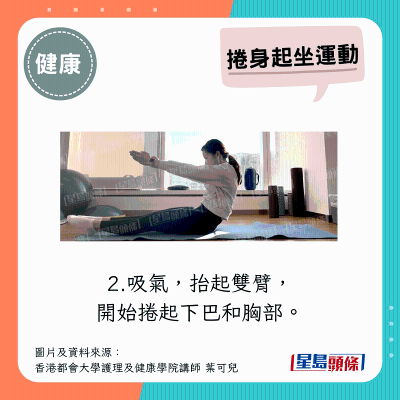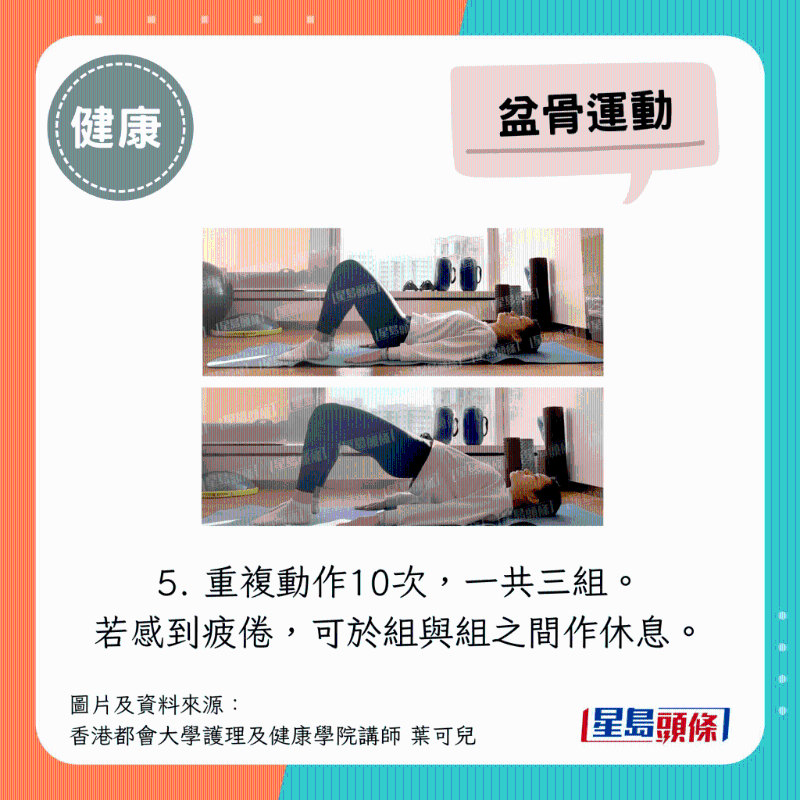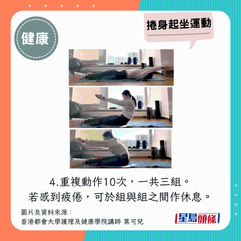 重复动作10次,一共三组。 若感到疲倦,可于组与组之间作休息。