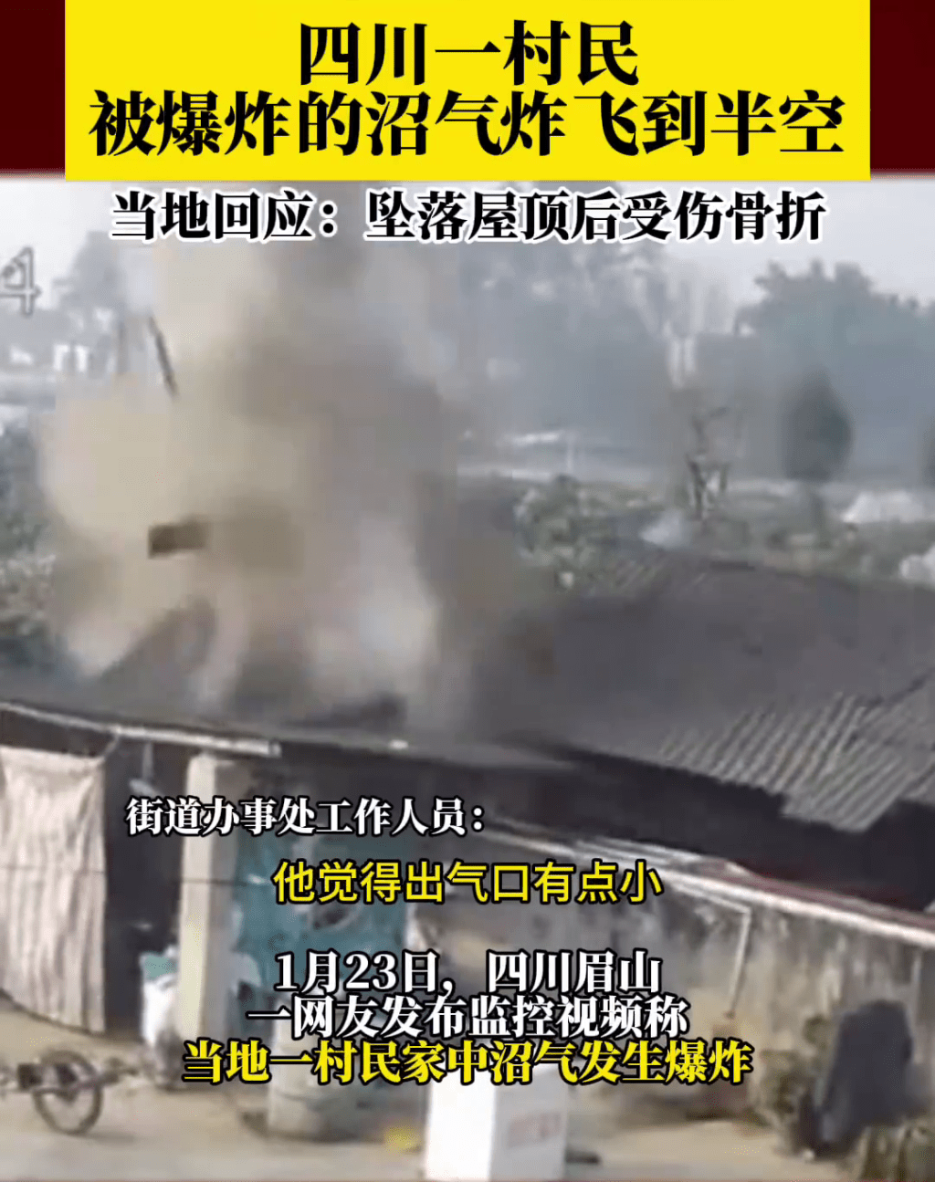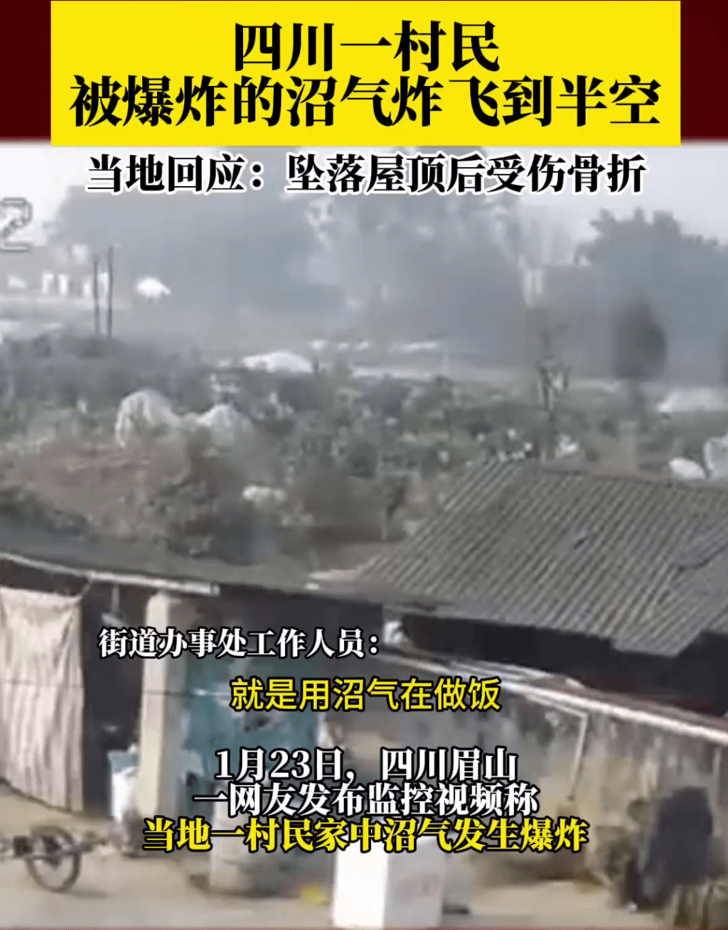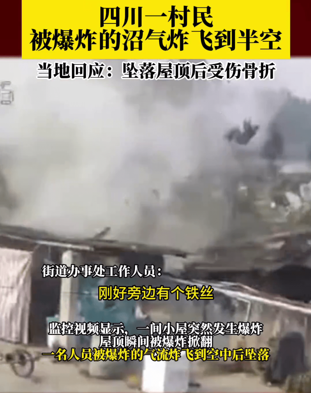 据网传监控画面显示,农村一间小棚屋突然发生爆炸,巨大冲击波将屋顶瞬间掀翻,接着一名男子随着气流炸飞到空中后重重堕落。影片发布者配文称“沼气爆炸,人都被炸飞起来了”。