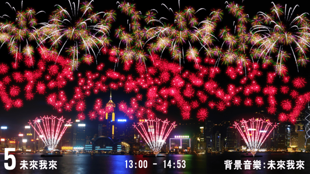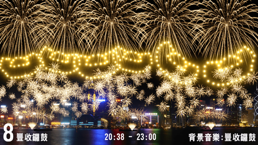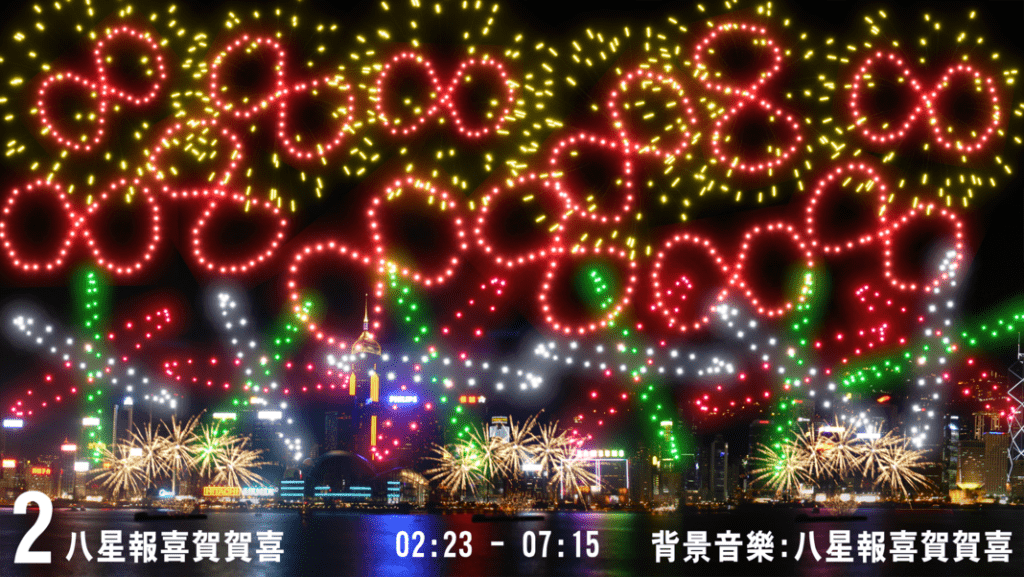 事隔五年再举办的农历新年烟花汇演将于2月11日大年初二晚上8时举行,以龙年百业旺盛世中华强为主题,共分8幕历时23分钟,发放23888枚烟花。 8幕烟花当中有不少寓意吉祥喜庆的烟花效果,例如第二幕“八星报喜贺贺喜”,空中放出“金色 8 字”及“红色 8 字变爆裂”的造型礼花弹,寓意广大市民财源滚滚。