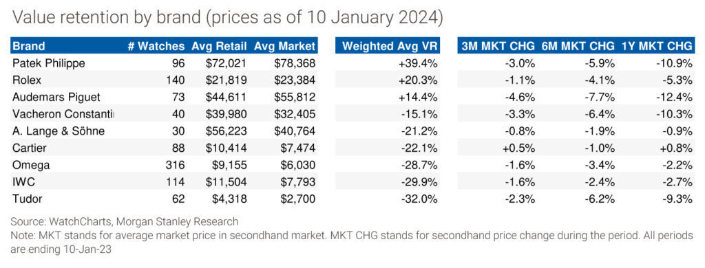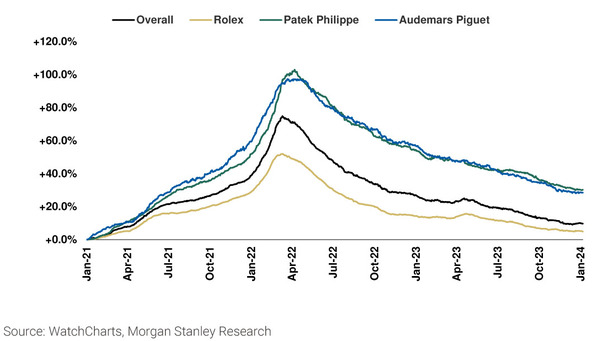 ▲摩根士丹利对WatchCharts价格走势的分析,发现在市场波动下,名表二手市价仍比2021年初高出10%。