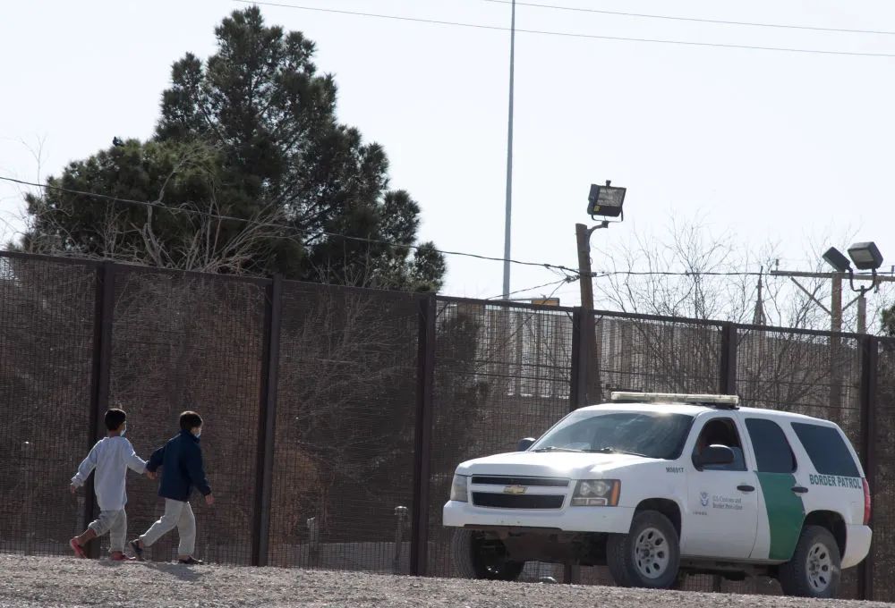 ▲这张2021年3月27日在墨西哥华雷斯拍摄的照片显示,两名来自危地马拉的移民儿童在跨越美墨边境的里奥格兰德河后,遇到美国边境巡逻队的执法车辆。新华社