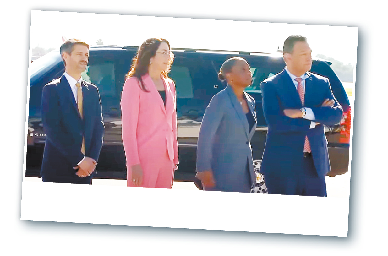 ▲副总统哈里斯昨抵圣荷西峰田机场,市长马汉(左一)、国会议员帕迪拉(右一)等接机。ABC 7