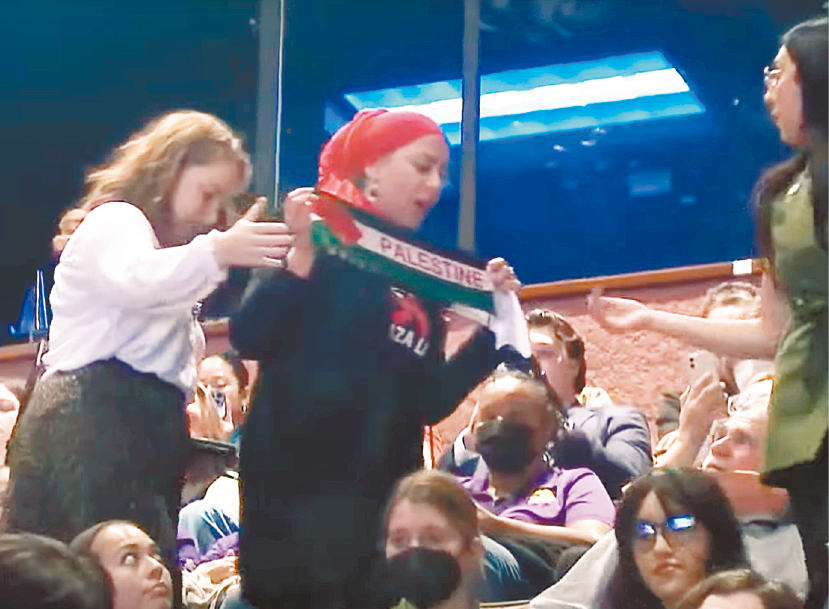 ▲哈里斯讲话时有支持加沙停火的示威人士打断。