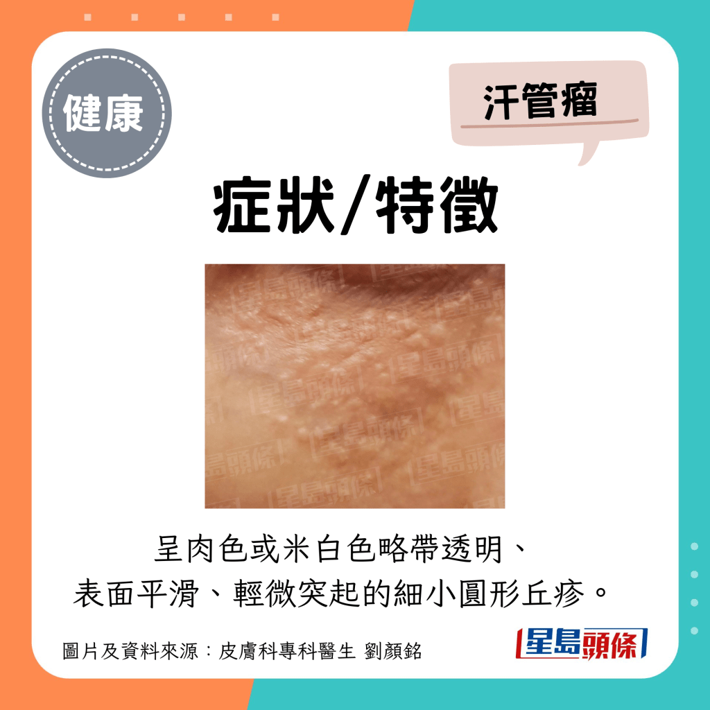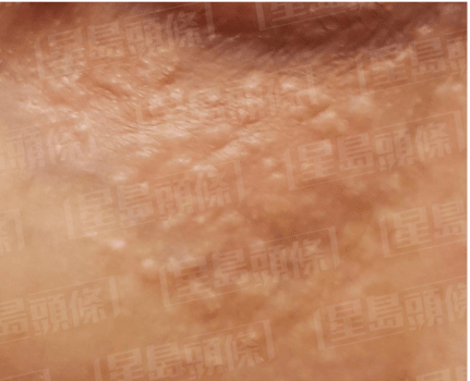 *呈肉色或啡黄色、圆形或不规则形状、轻微突起且平顶的细小颗粒;约1至4毫米,可以不均匀分散出现或数粒聚在一起。