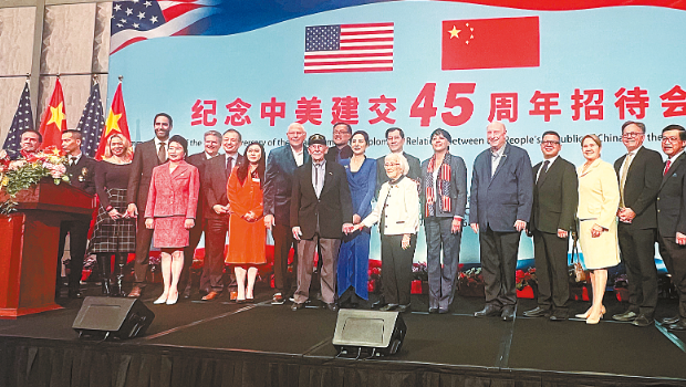 中国驻洛杉矶总领馆日前在环球影城希尔顿酒店(Hilton Universal City)隆重举办纪念中美建交45周年招待会,总领事郭少春指出中美关系是世界上最重要的双边关系,出席活动的众多联邦、加州和地方的民选官员一致肯定中国经济的发展和华人移民对美国的贡献,希望两国关系未来不断向前发展。