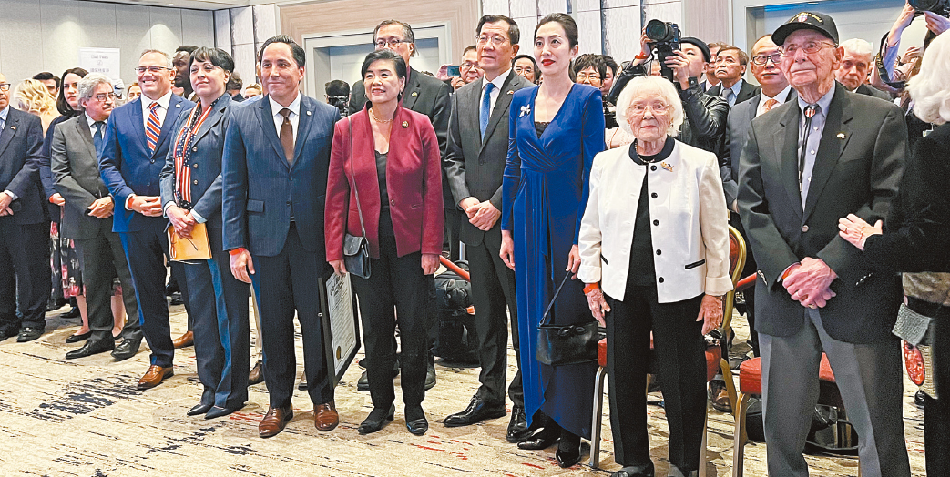 ▲飞虎队老兵麦克马伦(右一)及民选官员出席招待会。记者陆新摄