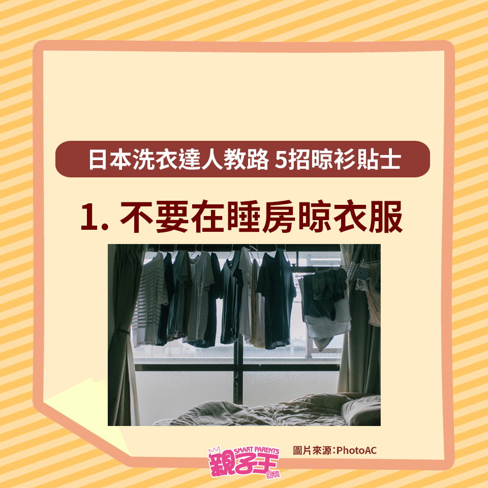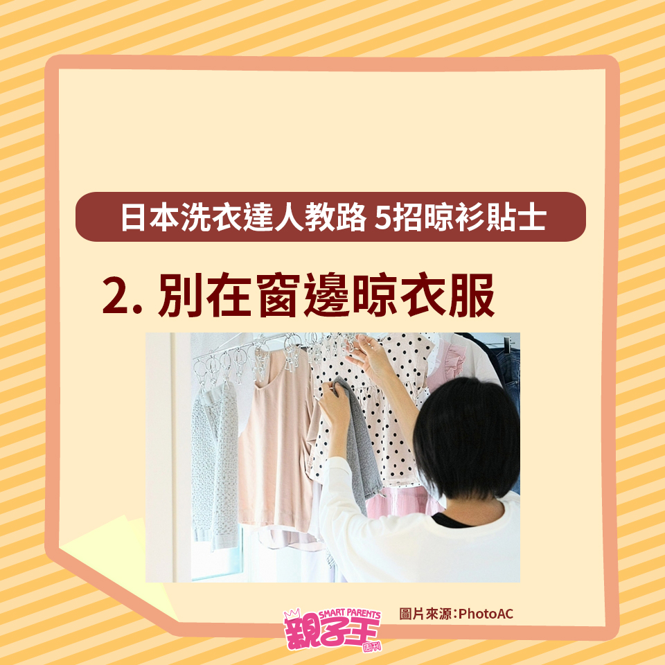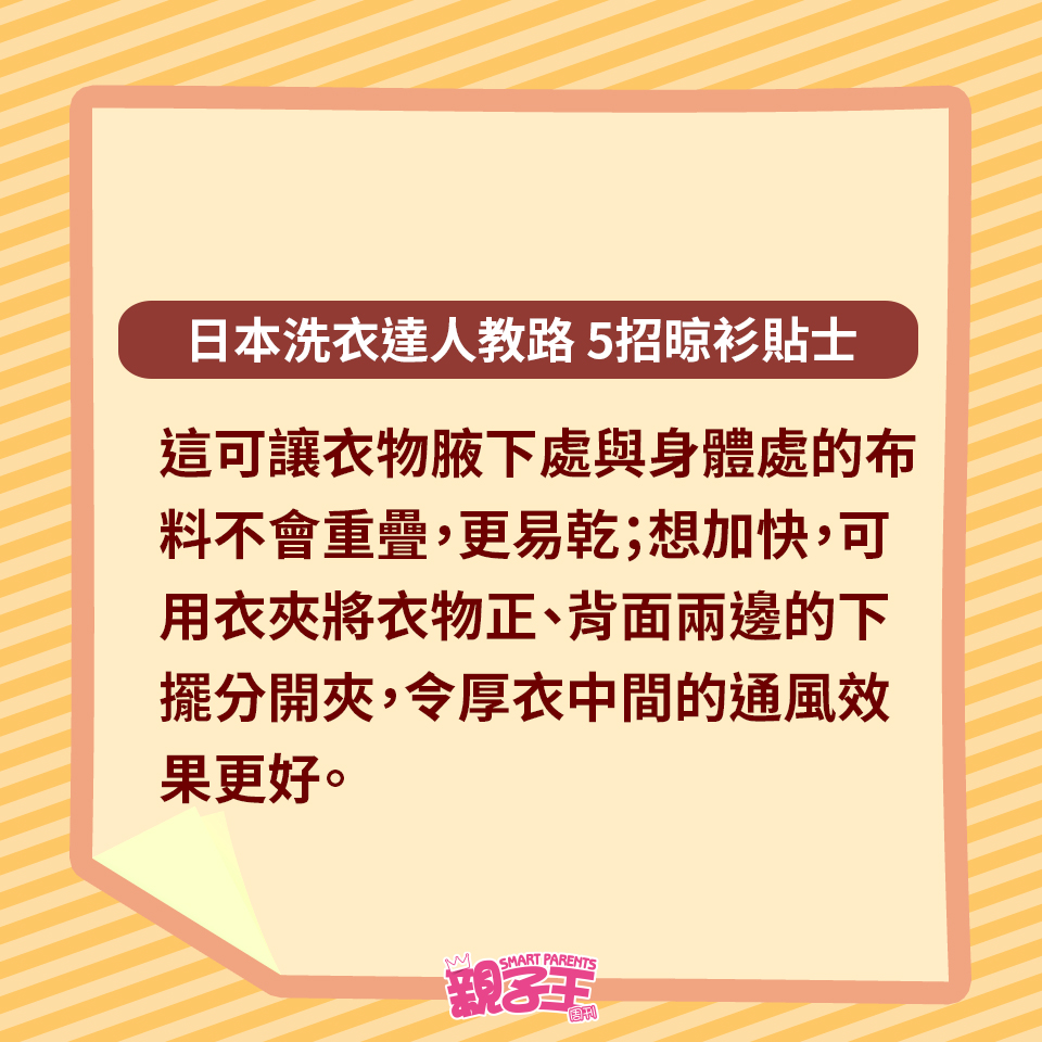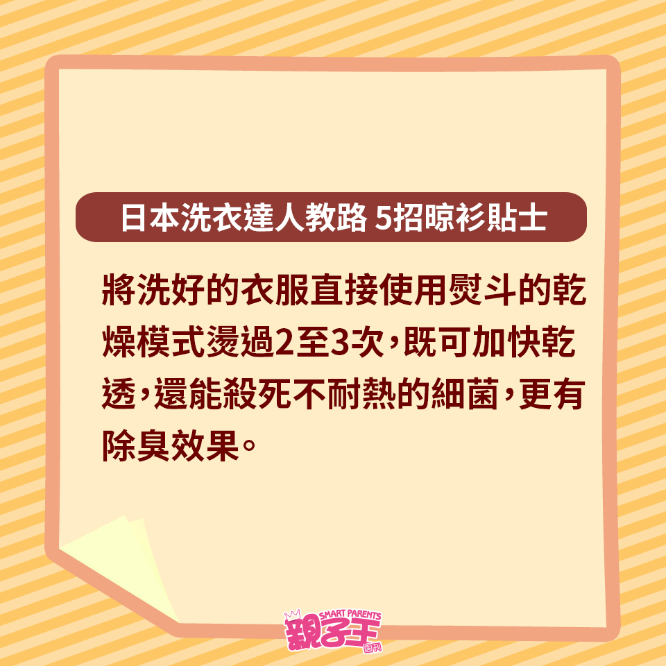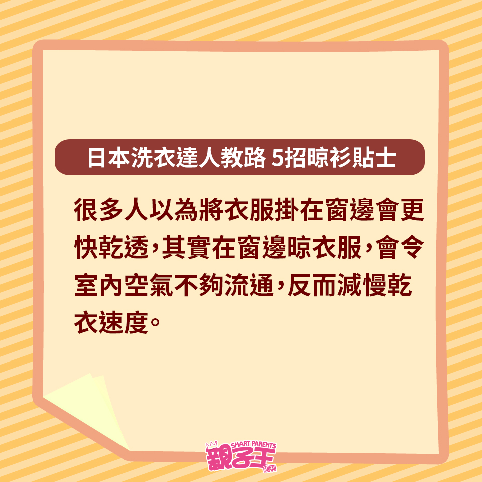 日本洗涤专家松延友记曾于节目分享,回南天潮湿时,洗完的衣物无论放多久都难以干透,更容易发出难闻的霉臭味,原来这是潜藏在潮湿衣物中的细菌“Moraxella”的排泄物所造成,别小看这些细菌,除了会带来难闻气味,也有机会造成肺炎等多种疾病,故此一定要清除。 如想减少因衣服难干而细菌滋生,就要用以下5种方式来帮助快速晾干衣服。