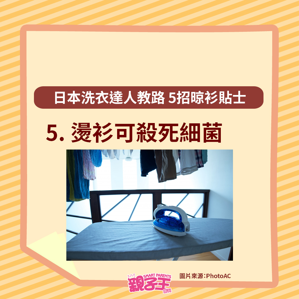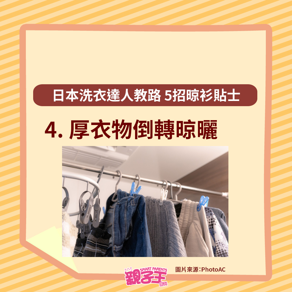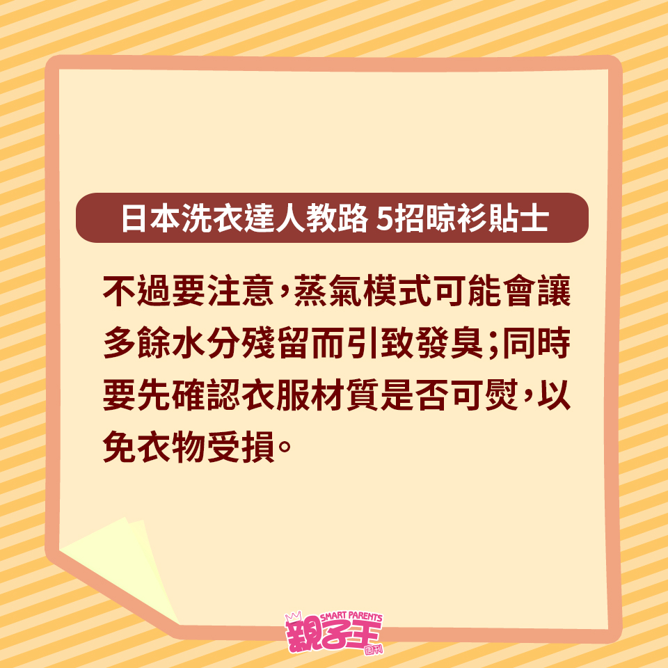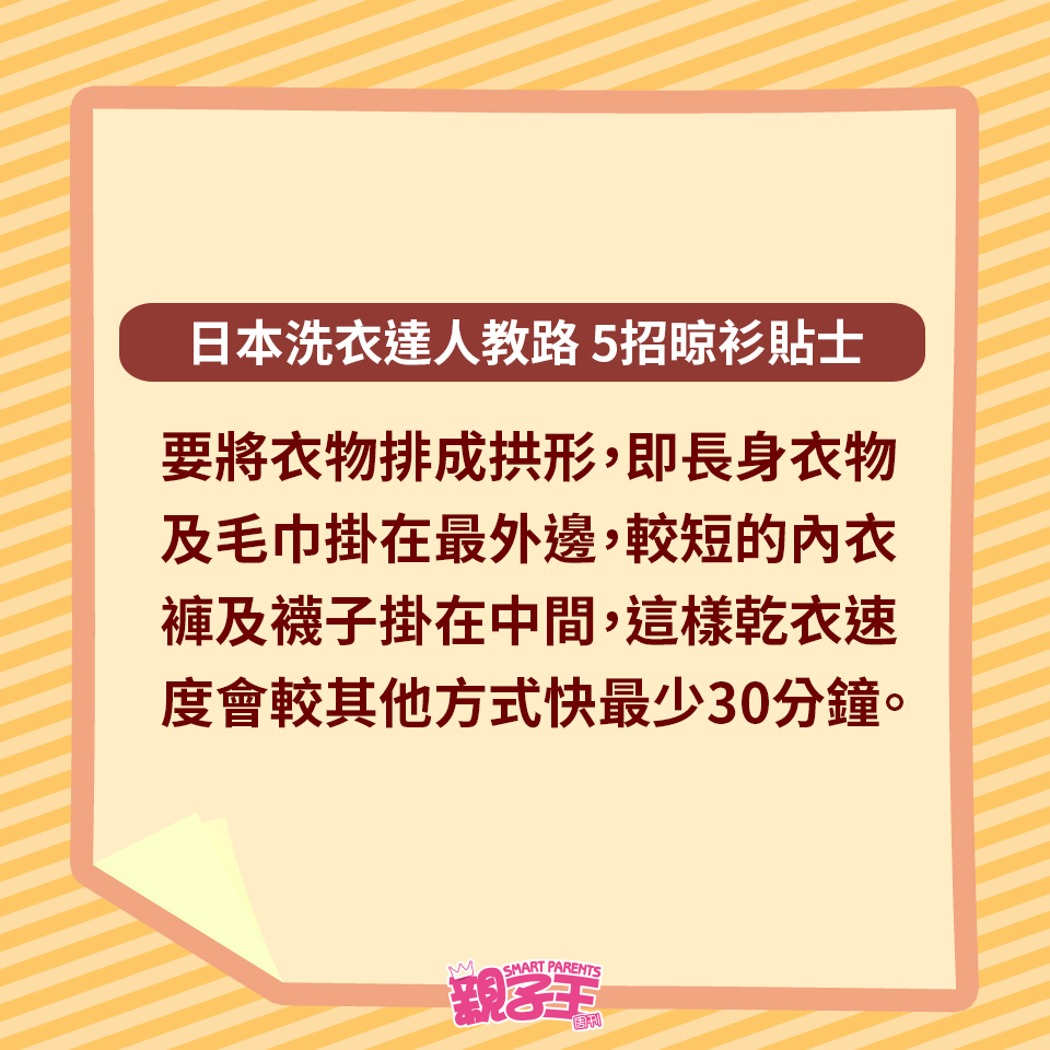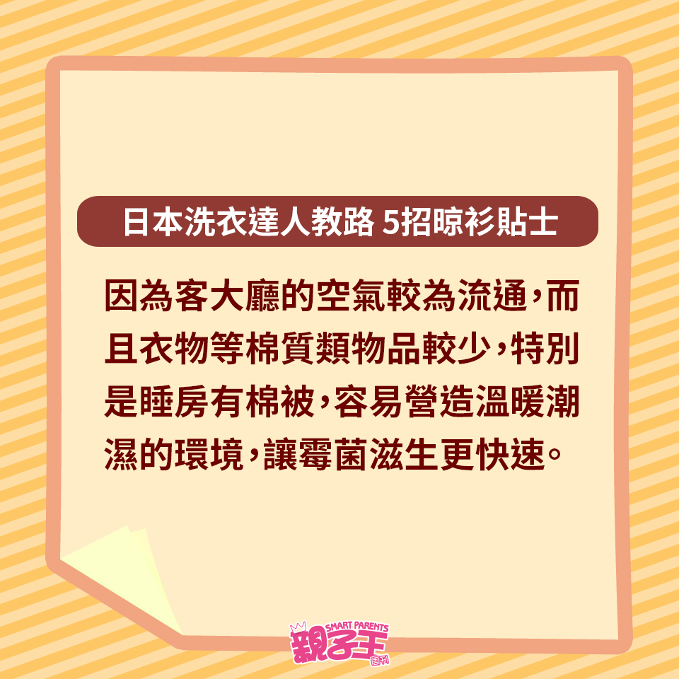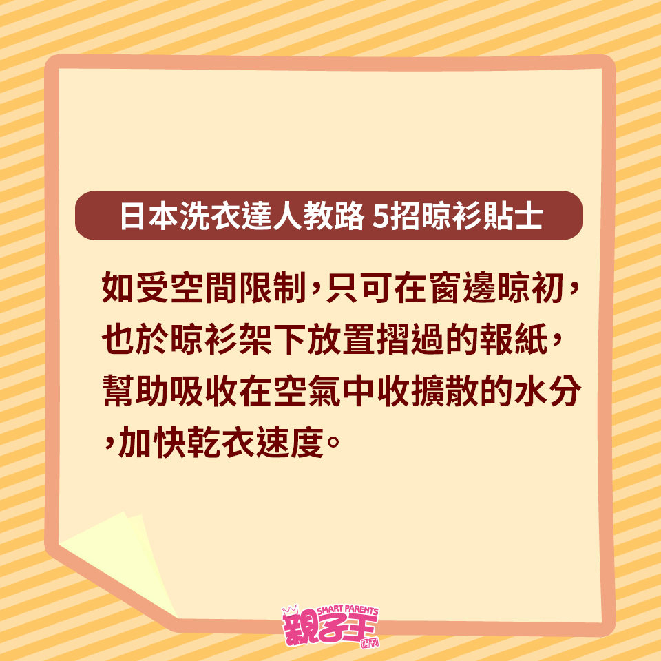 日本洗涤专家松延友记曾于节目分享,回南天潮湿时,洗完的衣物无论放多久都难以干透,更容易发出难闻的霉臭味,原来这是潜藏在潮湿衣物中的细菌“Moraxella”的排泄物所造成,别小看这些细菌,除了会带来难闻气味,也有机会造成肺炎等多种疾病,故此一定要清除。 如想减少因衣服难干而细菌滋生,就要用以下5种方式来帮助快速晾干衣服。