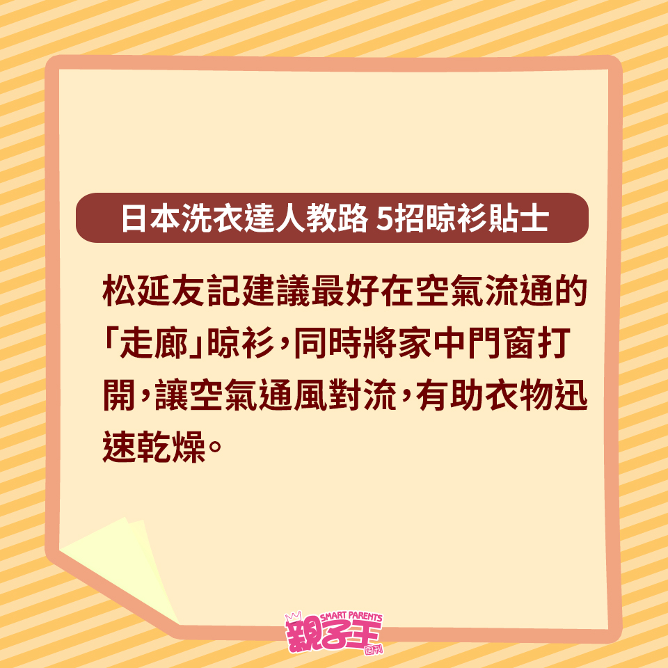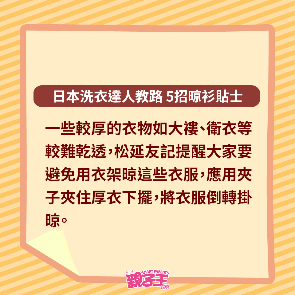 香港天文台天气预报显示,这星期相对湿度天天达80%-95%以上!妈妈们就最讨厌这种天气,事关洗完衣服难以晾干,衣服又易滋生细菌而传出难闻霉味。日本洗涤达人松延友记就教大家5招干衣晾衫贴士,令衣服在这个回南天时仍可尽快干透,减少霉菌量;而衣服干透后亦要学识日本家事达人每田祥子的4个衣服防潮湿法,衣服才可时刻保持干爽,保持气味清新。