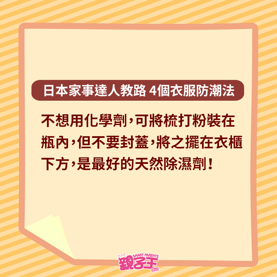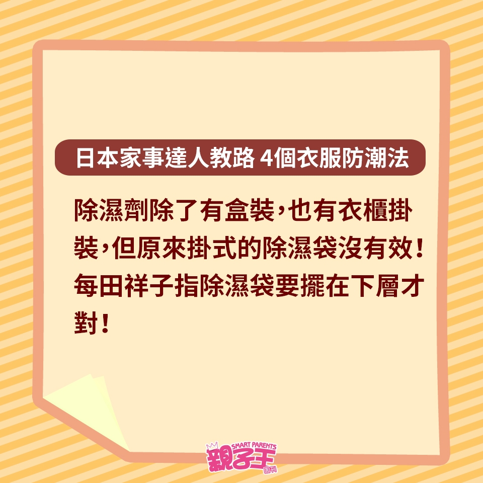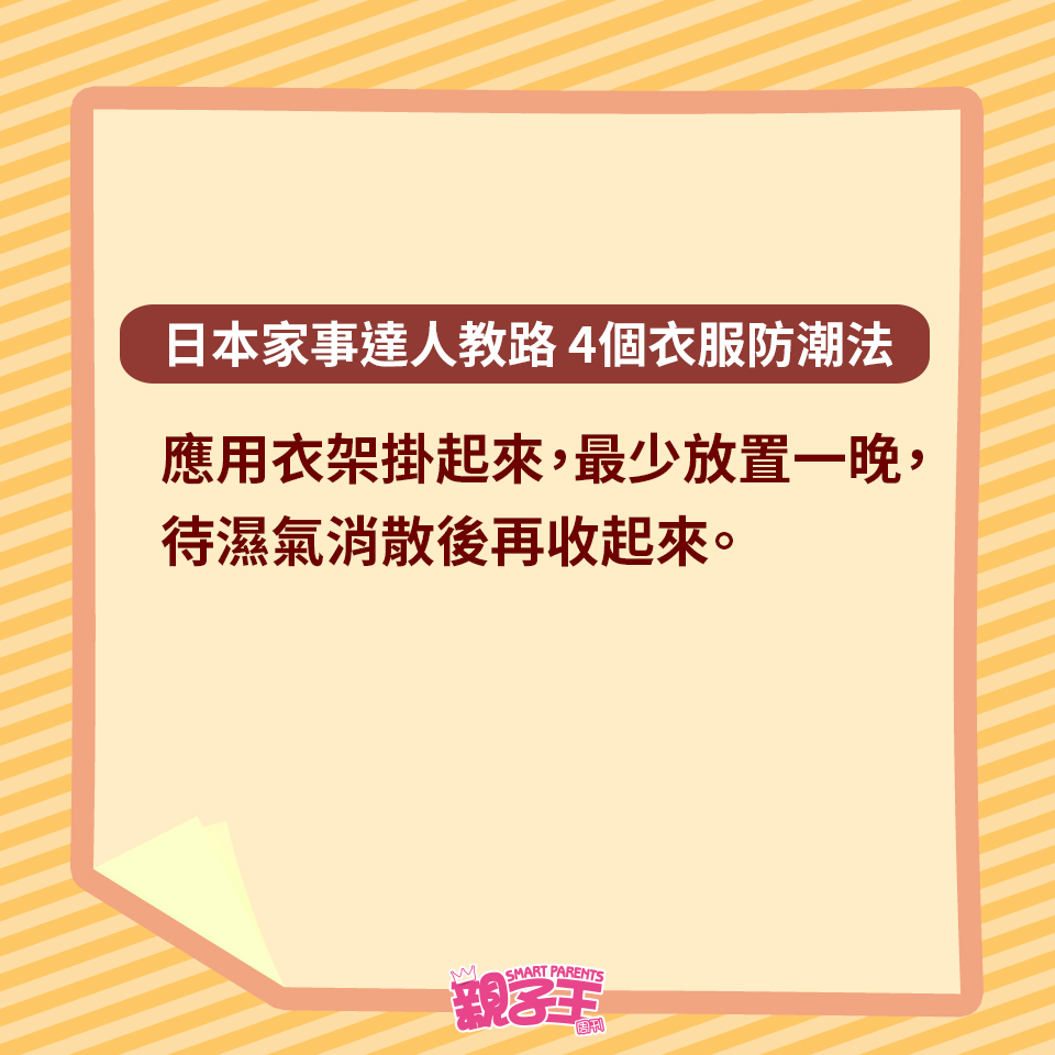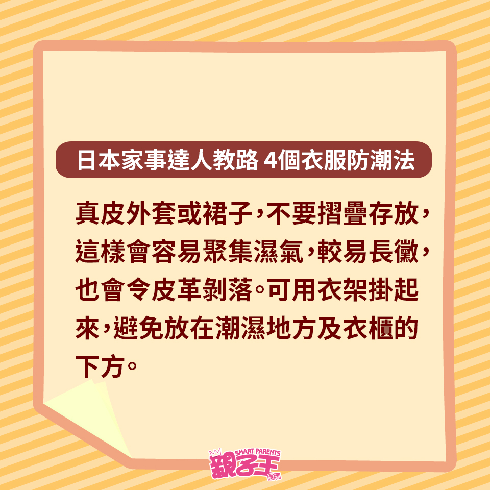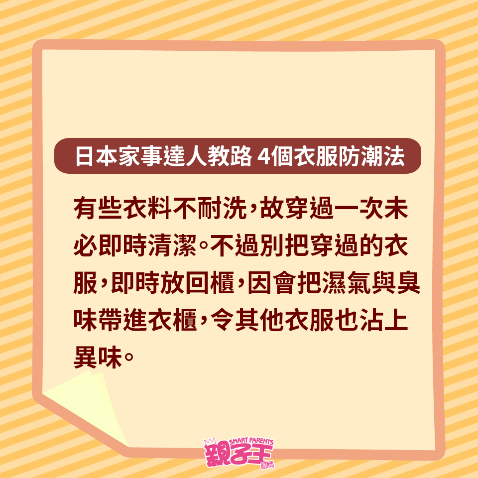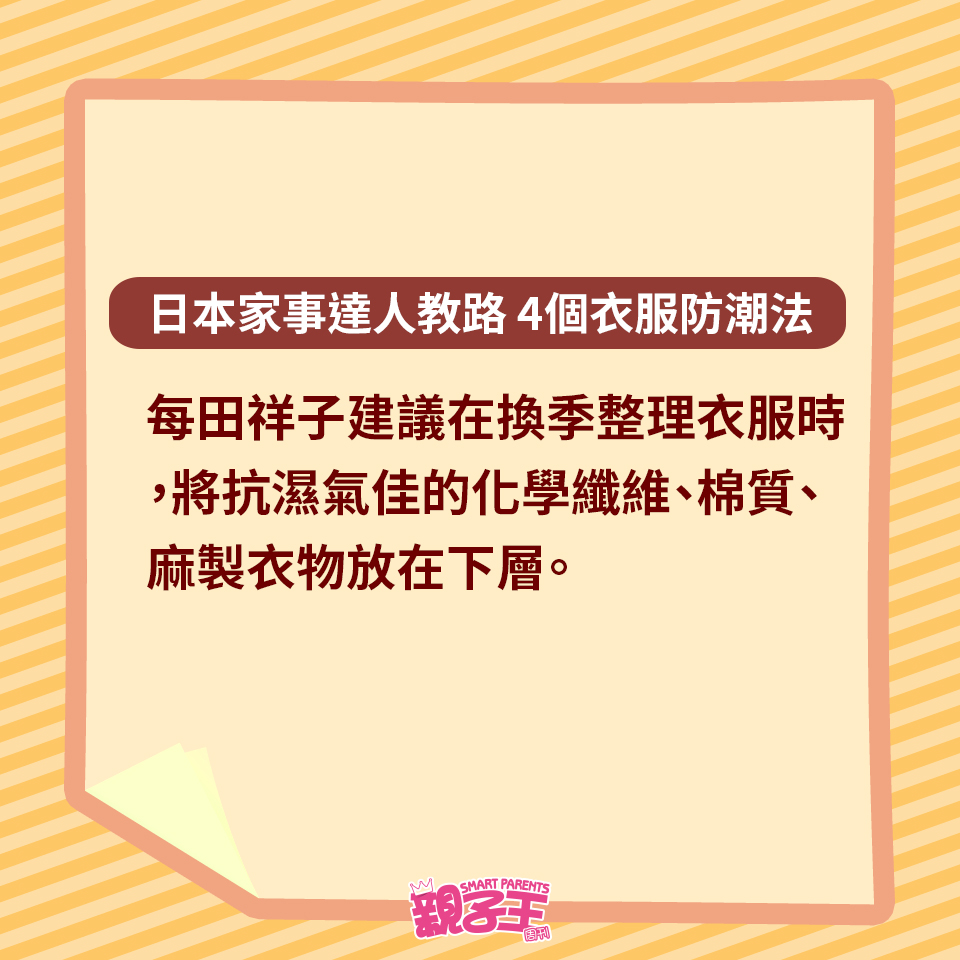 回南天除了晾衫困扰妈妈们,如果衣服收藏不当,衣柜或柜子更会有阵霉味。不想衣服出现霉菌黑点,日本家事达人每田祥子就教大家用以下4个方法收藏衣服,便有效赶走湿气,更有助对付臭味及发霉元凶。