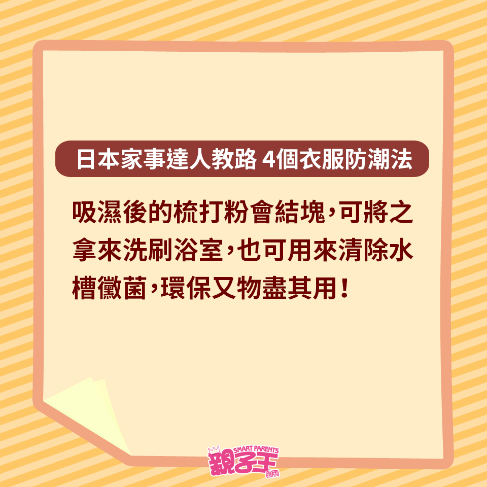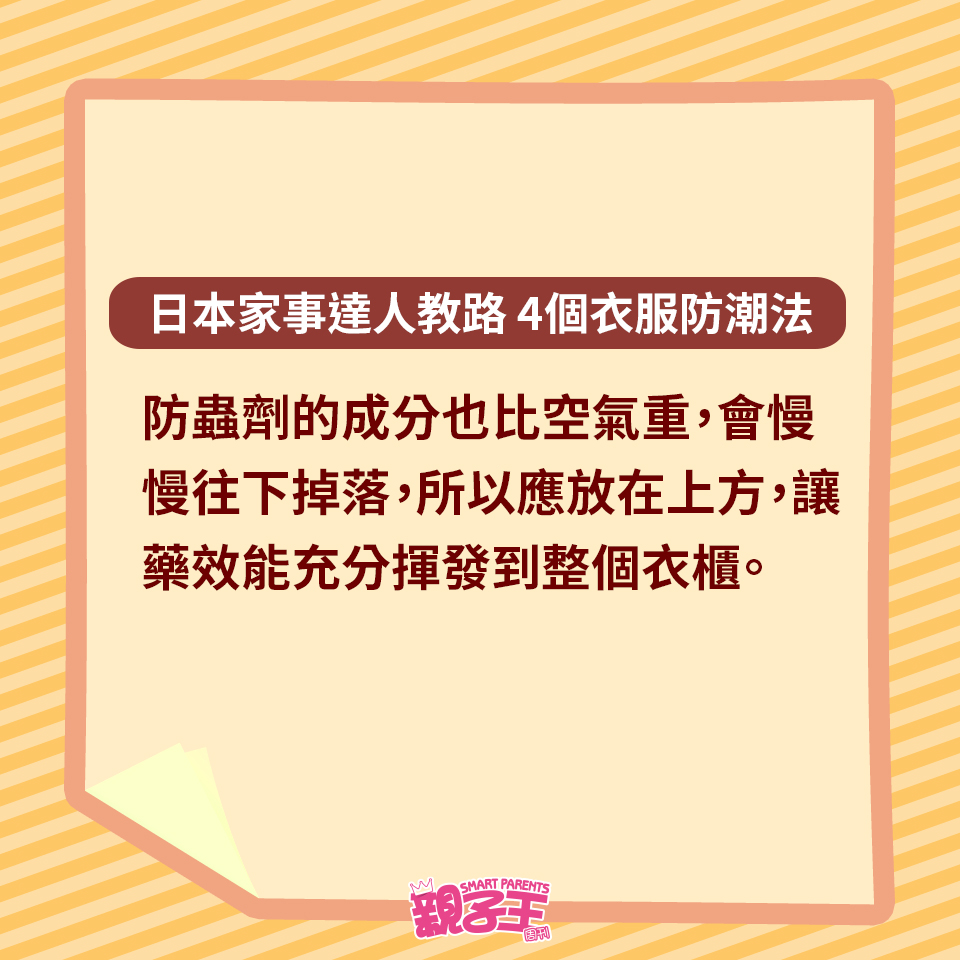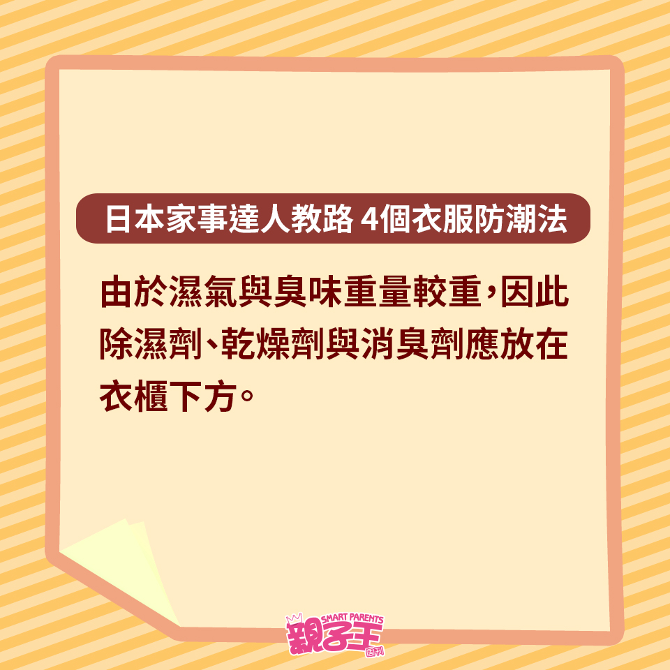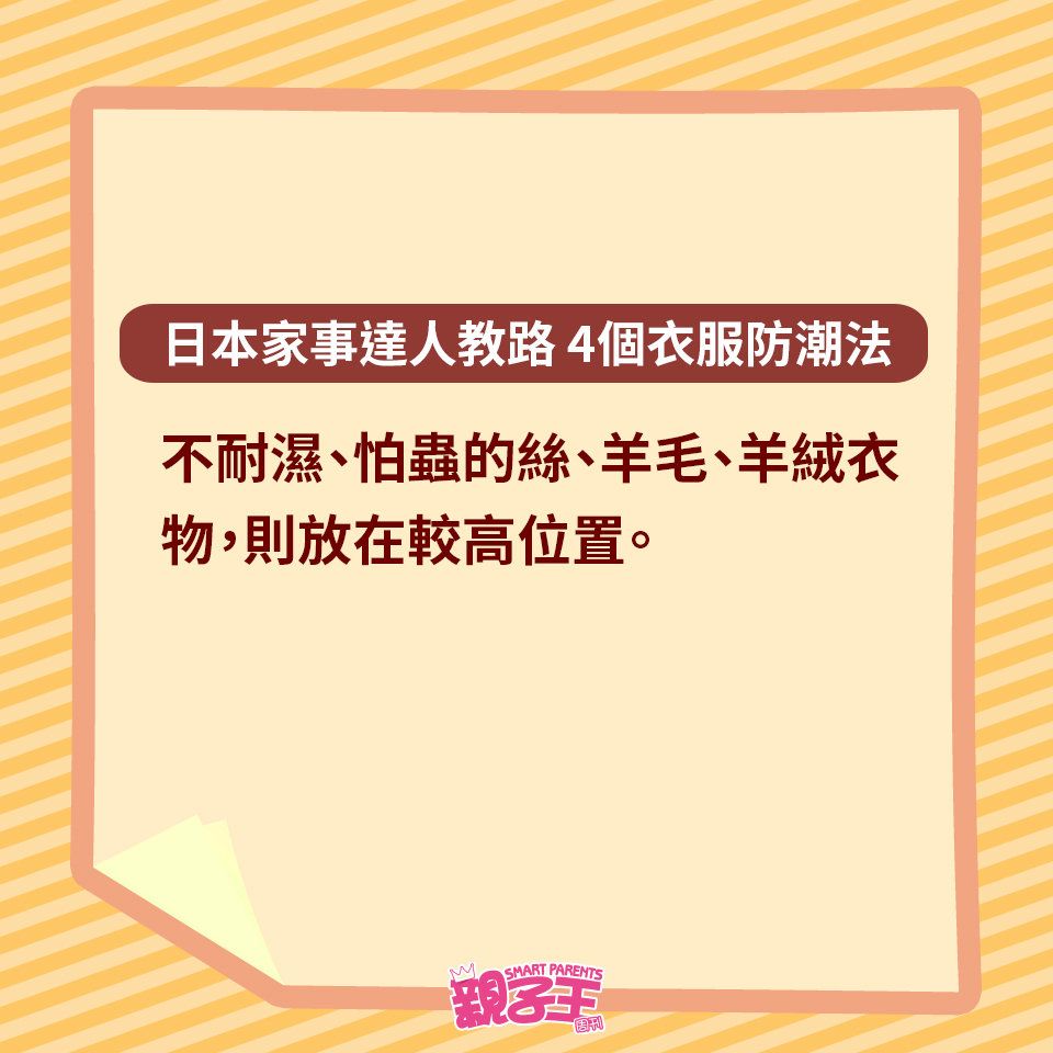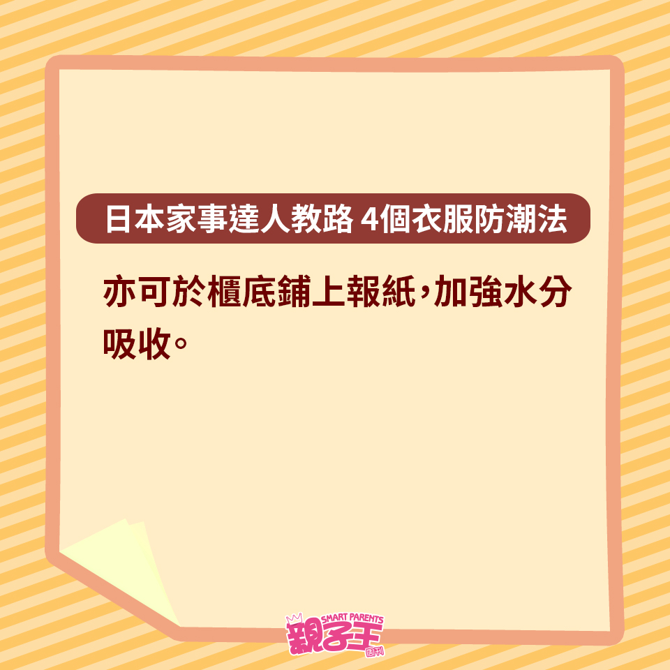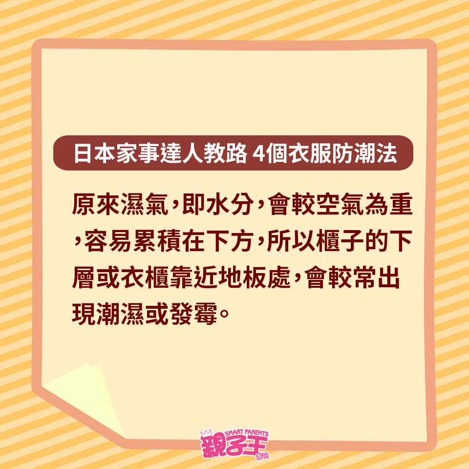 回南天除了晾衫困扰妈妈们,如果衣服收藏不当,衣柜或柜子更会有阵霉味。不想衣服出现霉菌黑点,日本家事达人每田祥子就教大家用以下4个方法收藏衣服,便有效赶走湿气,更有助对付臭味及发霉元凶。